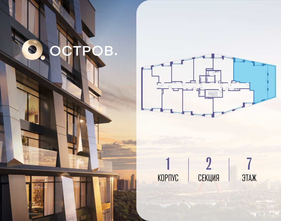 ОСТРОВ.12.1 - часть жилого комплекса на западе Москвы, в 15 минутах езды от центра. Это настоящий заповедник посреди большого города, в окружении реки и 650 га заповедников. Здесь все необходимое находится по соседству: от детского сада до супермаркета, от фитнес-зала до серфинг-центра. На территории созданы все условия для отдыха и общения: клубная инфраструктура в домах и дворы-парки, набережные и променады, маршруты для спортсменов, детей и возрастных жителей. В нескольких минутах ходьбы расположена станция метро ''Мнёвники'' БКЛ. На автомобиле - 10 минут до Москва-Сити и 15 минут до Садового кольца.