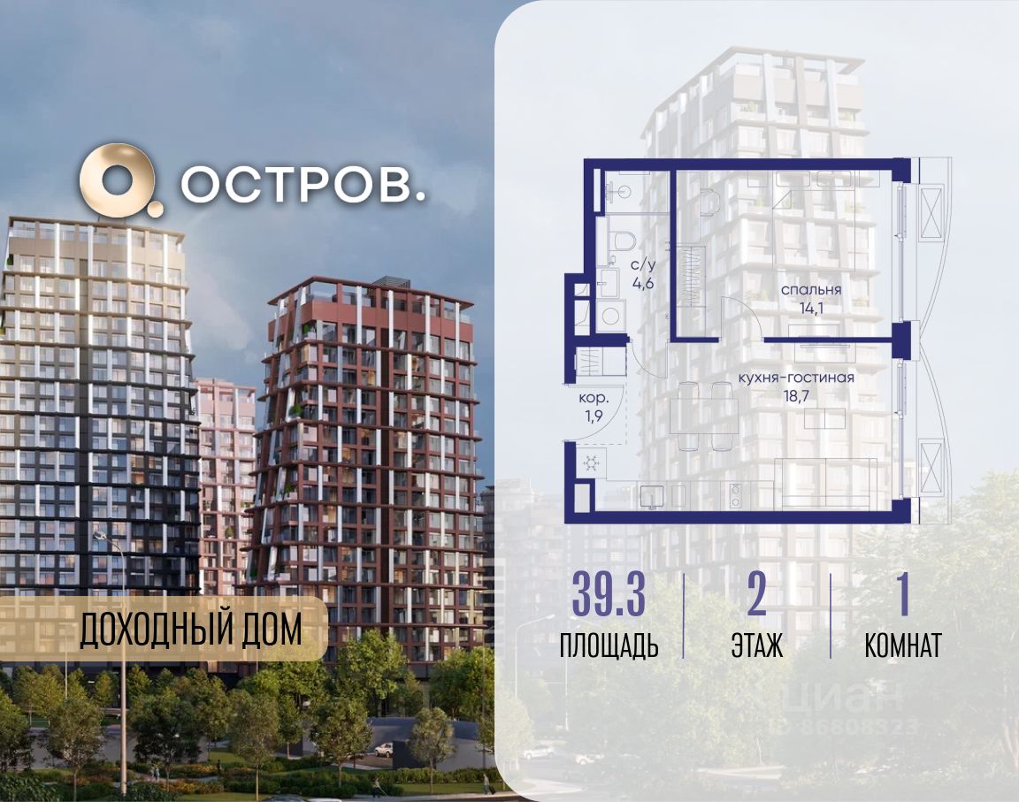 Продаётся 1-комн. квартира от застройщика: общая площадь 39.30 м², жилая 14.10 м², кухня 18.70 м², 2-й этаж, жилой квартал ''Остров 14'', корпус 1 (секция 1). Срок сдачи: 2 квартал 2029 года. .