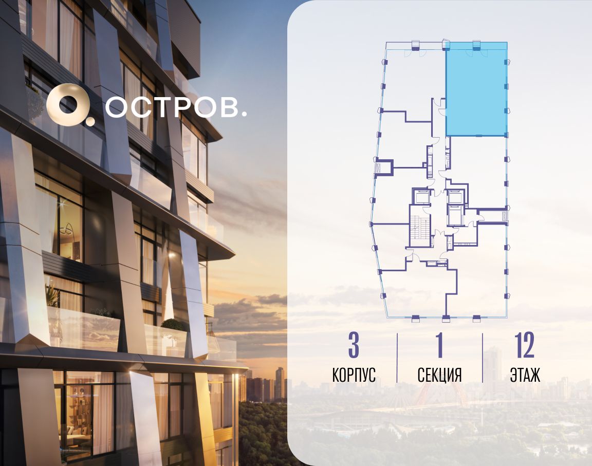 ОСТРОВ.12.1 - часть жилого комплекса на западе Москвы, в 15 минутах езды от центра. Это настоящий заповедник посреди большого города, в окружении реки и 650 га заповедников. Здесь все необходимое находится по соседству: от детского сада до супермаркета, от фитнес-зала до серфинг-центра. На территории созданы все условия для отдыха и общения: клубная инфраструктура в домах и дворы-парки, набережные и променады, маршруты для спортсменов, детей и возрастных жителей. В нескольких минутах ходьбы расположена станция метро ''Мнёвники'' БКЛ. На автомобиле - 10 минут до Москва-Сити и 15 минут до Садового кольца.