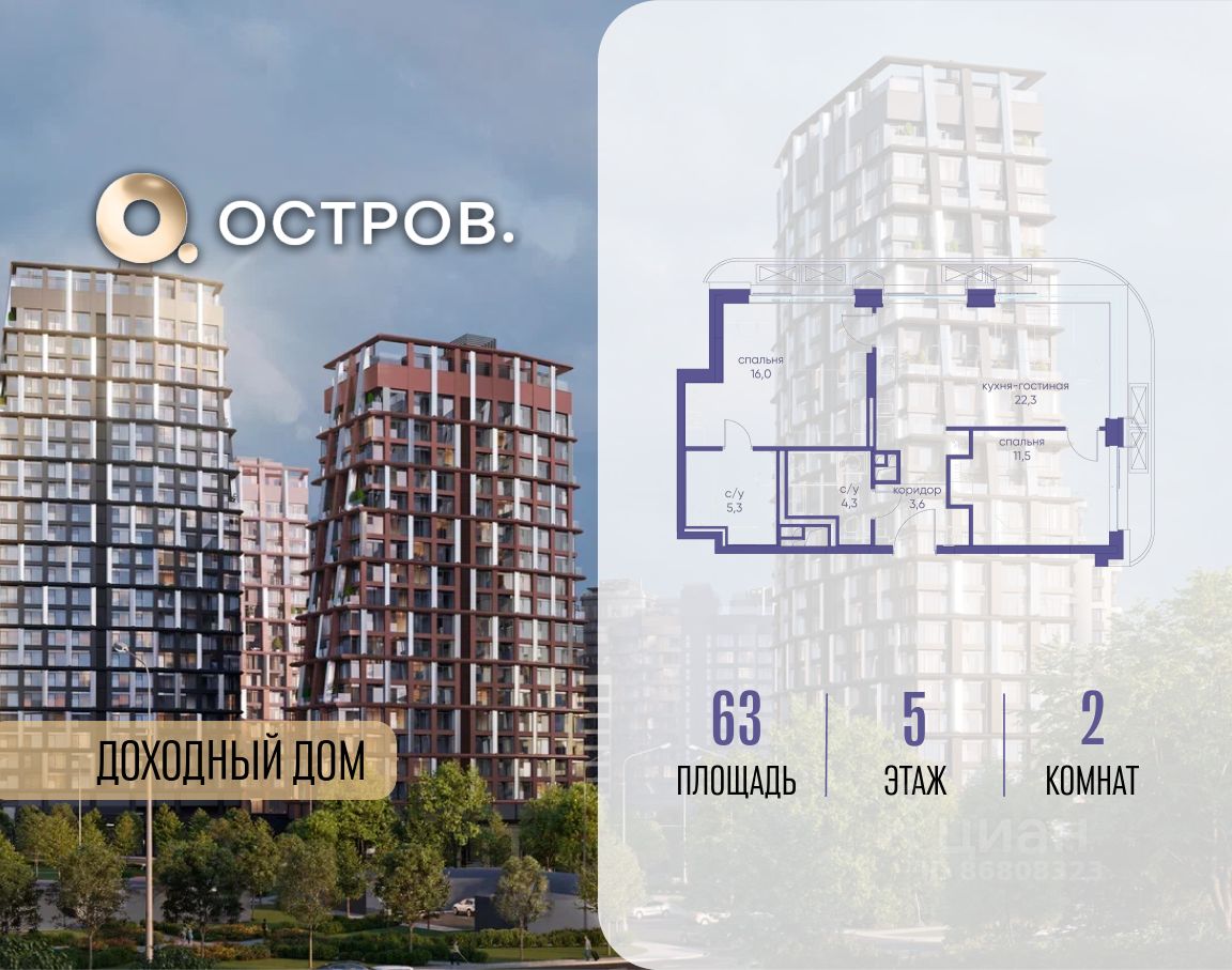 Продаётся 2-комн. квартира от застройщика: общая площадь 63.00 м², жилая 27.50 м², кухня 22.30 м², 5-й этаж, жилой квартал ''Остров 14'', корпус 1 (секция 2). Срок сдачи: 2 квартал 2029 года. 2 совмещенных санузла.