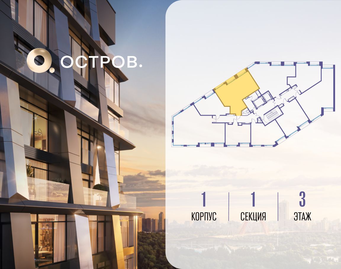 ОСТРОВ.12.1 - часть жилого комплекса на западе Москвы, в 15 минутах езды от центра. Это настоящий заповедник посреди большого города, в окружении реки и 650 га заповедников. Здесь все необходимое находится по соседству: от детского сада до супермаркета, от фитнес-зала до серфинг-центра. На территории созданы все условия для отдыха и общения: клубная инфраструктура в домах и дворы-парки, набережные и променады, маршруты для спортсменов, детей и возрастных жителей. В нескольких минутах ходьбы расположена станция метро ''Мнёвники'' БКЛ. На автомобиле - 10 минут до Москва-Сити и 15 минут до Садового кольца.
