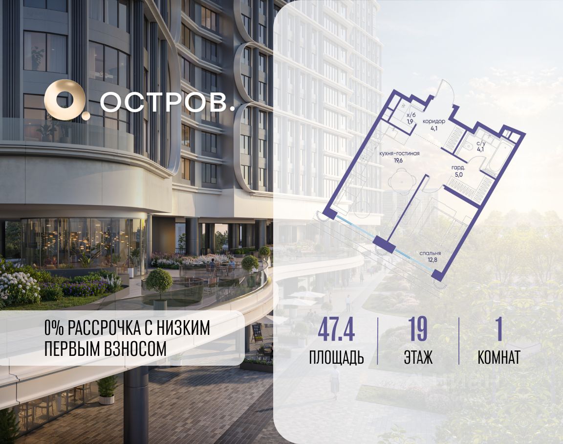 Продаётся однокомнатная квартира от застройщика: общая площадь 47.40 м², жилая 12.80 м², кухня 19.60 м², 19, жилой квартал ''Остров 7'', корпус 7 (7 квартал) (секция 1). срок сдачи: 4-кв. 2025. , 1 совмещенный санузел. В жилой зоне 2 больших окна на одну сторону, хорошая инсоляция.