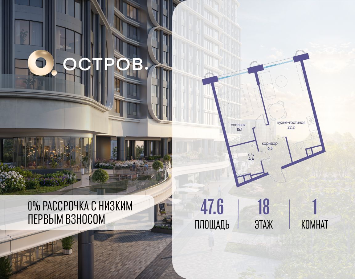 Продаётся однокомнатная квартира от застройщика: общая площадь 47.60 м², жилая 15.10 м², кухня 22.20 м², 18, жилой квартал ''Остров 7'', корпус 7 (7 квартал) (секция 1). срок сдачи: 4-кв. 2025. , 1 совмещенный санузел. В жилой зоне 2 больших окна на одну сторону, хорошая инсоляция.