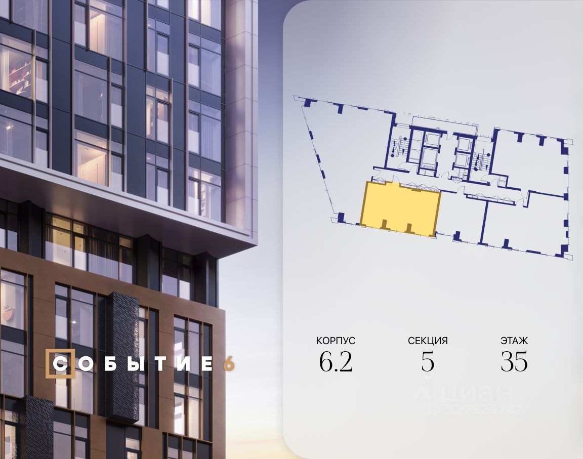 Продаётся 2-комнатная квартира от застройщика: общая площадь 61.90 м², жилая 33.00 м², кухня 17.80 м², 35-й этаж, жилой квартал ''Событие-6'', корпус 2 (секция 5) Срок сдачи: 1 квартал 2029 года.