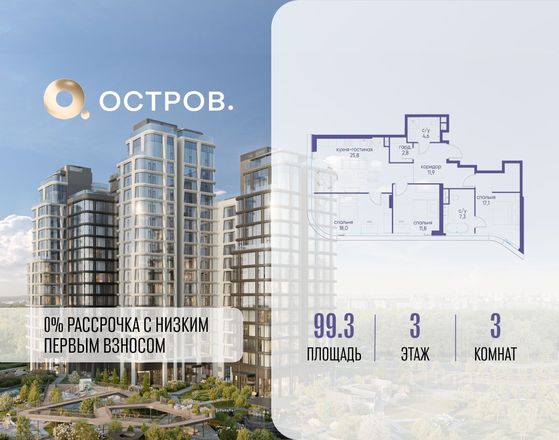 Продаётся 3-комн. квартира от застройщика: общая площадь 99.30 м², жилая 46.90 м², кухня 25.80 м², 3-й этаж, жилой квартал ''Остров 12'', корпус 6 (секция 1). Срок сдачи: 1 квартал 2029 года. 2 совмещенных санузла. В жилой зоне 2 больших окна на одну сторону, хорошая инсоляция.