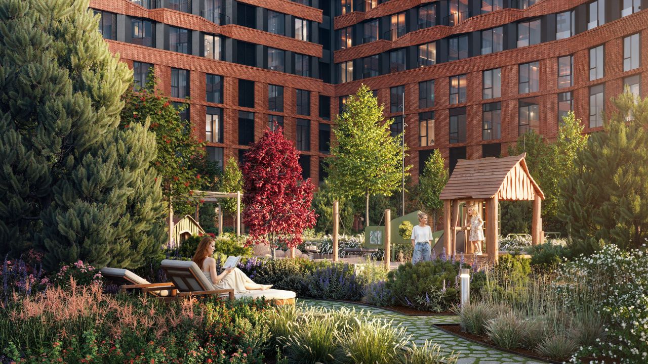 Благоустройство Центральным элементом квартала станет благоустроенный двор-парк площадью 3 га с собственным прудом и зелеными зонами для прогулок и отдыха. В границах двора предусмотрены современные игровые и спортивные площадки: мультифункциональная зона воркаута, площадки для волейбола и стритбола, площадки для пилатеса и йоги, скалодром, а также беговые и веломаршруты. В состав проекта войдет образовательный центр, включающий детский сад для 350 малышей, а также школу на 650 учеников.