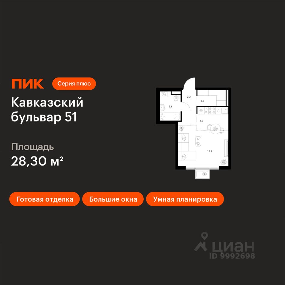 Продаётся квартира-студия площадью 28,3 кв.м на 15 этаже 23 этажного дома (Корпус 3.1, Секция 1) проекта ПИК Кавказский бульвар 51. Светлый просторный подъезд на уровне земли, функциональная планировка, большие окна, c отделкой.