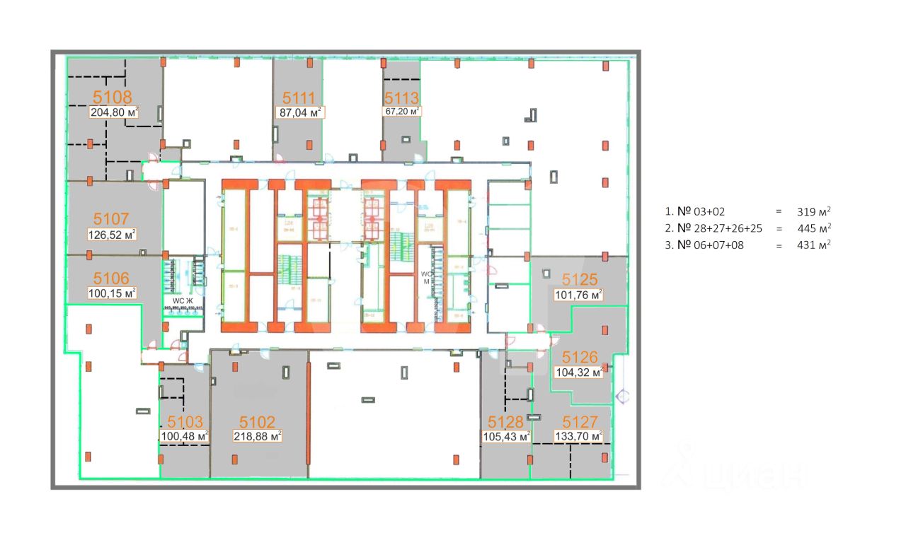 Этот лот состоит из нескольких помещений: 105 кв. м., 88 кв. м., 110 кв. м. и 220 кв. м.