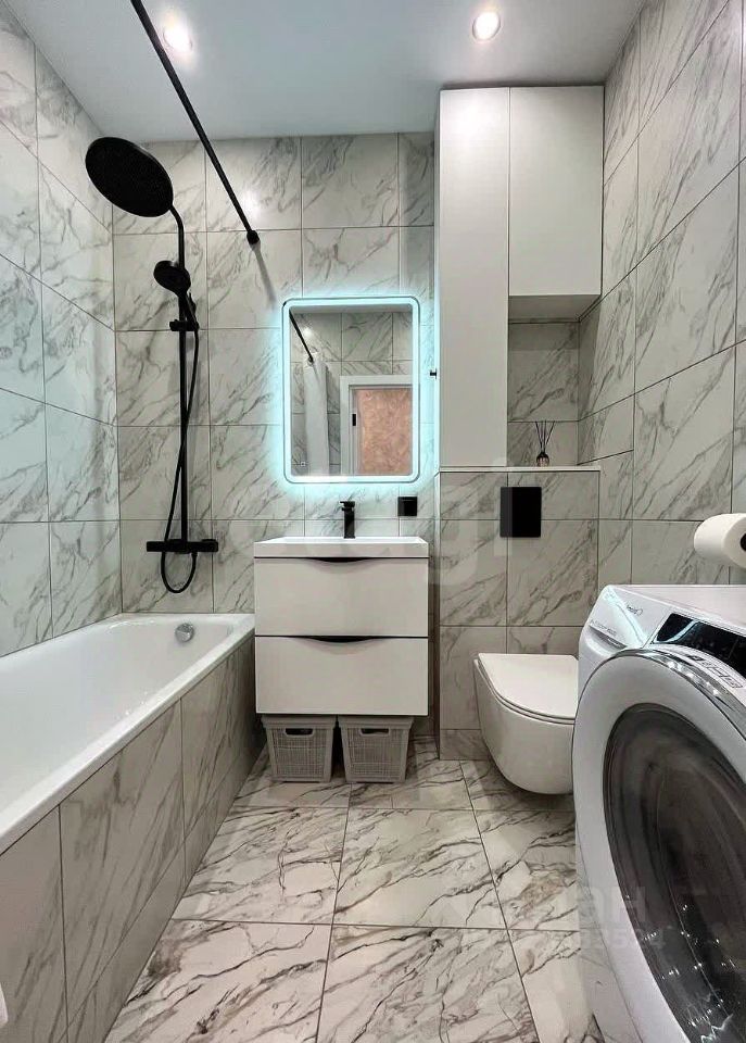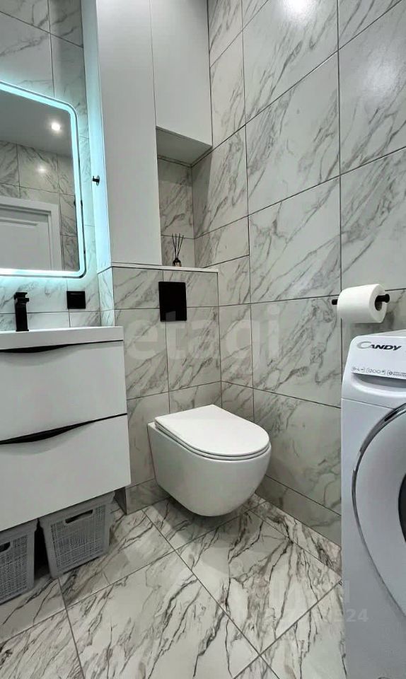 В санузле ручной и тропический душ GAPPO, вытяжка DiCiTi, стиральная машина с функцией сушки белья Candy, электрический полотенцесушитель, качественная разводка труб с защитой от протечек.