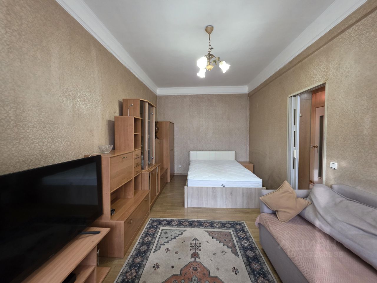 Большая двуспальная кровать с хорошим матрасом, диван, телевизор, в ванной комнате теплые полы, ванна, стиральная машина. Хорошо организована система хранения.