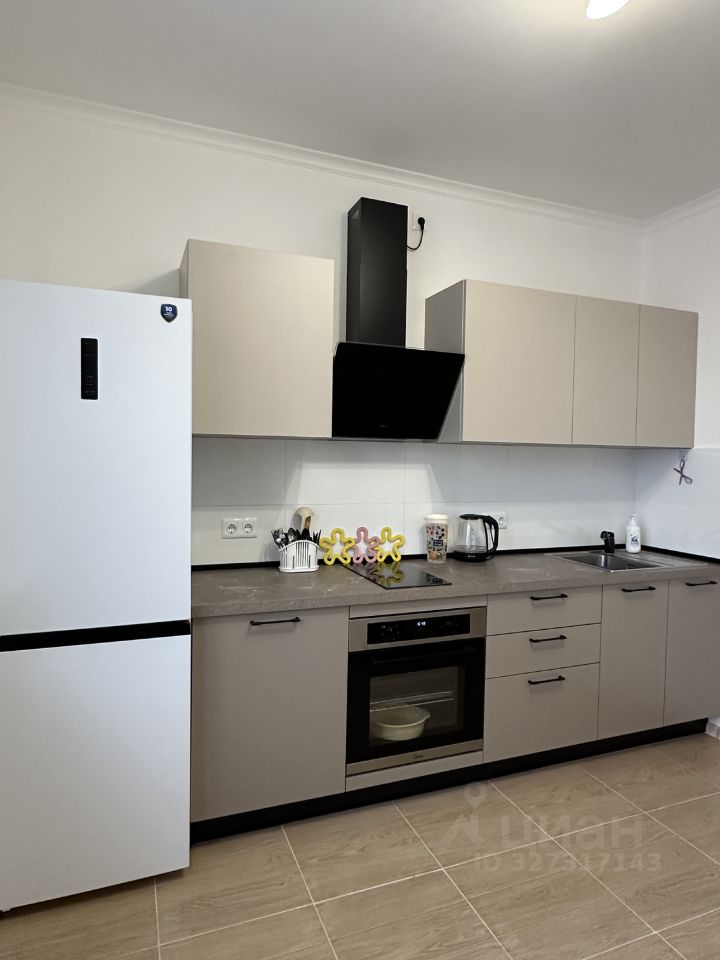 Кухонный гарнитур, холодильник, вытяжка, духовка, варочная панель, стол обеденный, стулья.