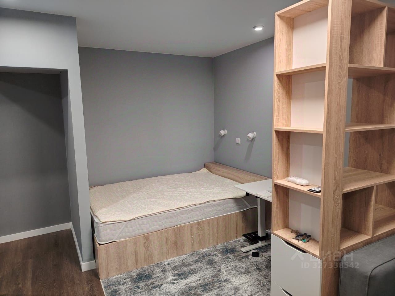 Полностью меблирована: двуспальная кровать, компьютерный стол, стеллаж, тумба под ТВ, диван. В прихожей вместительный шкаф для одежды.