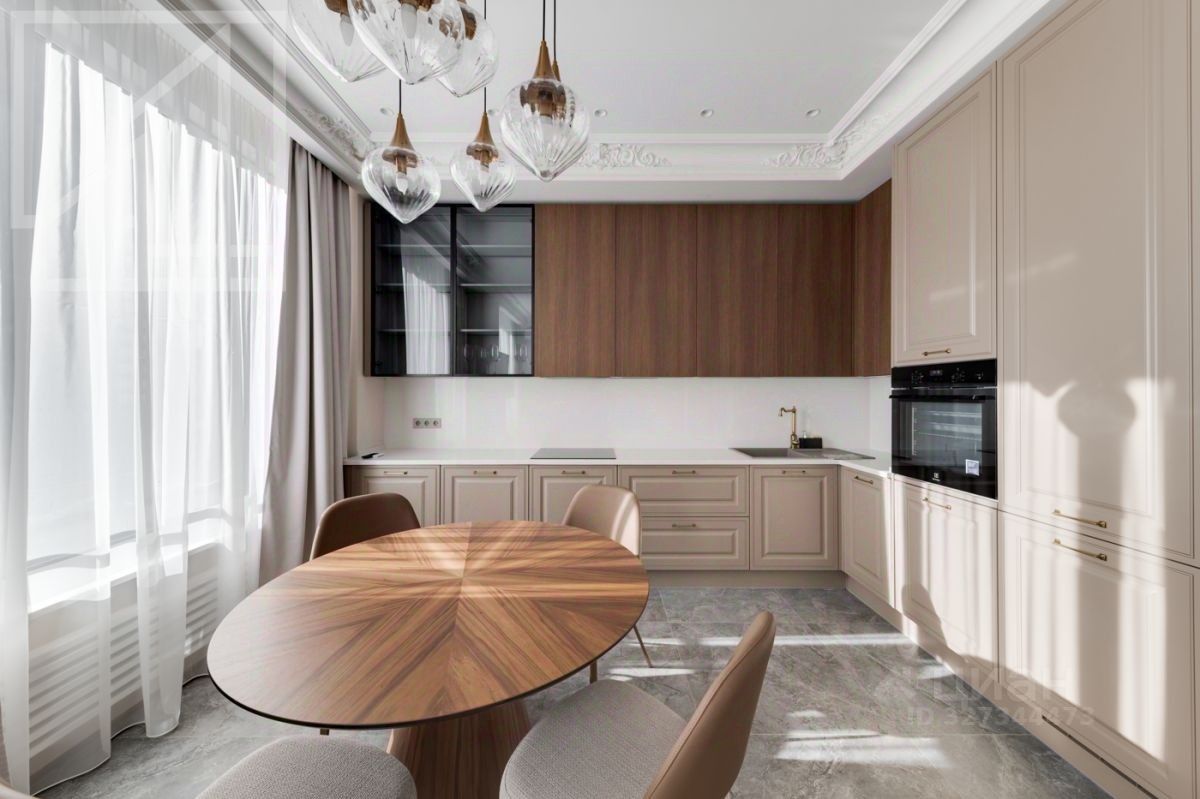 Планировка: просторная кухня-гостиная, две спальни, два совмещенных санузла (один с душевой кабиной, второй с ванной). Есть прачечная. Выполнена премиальная дизайнерская отделка в современном стиле (неоклассика).Квартира полностью меблирована и оснащена бытовой техникой. Окна выходят во внутренний закрытый двор-парк.