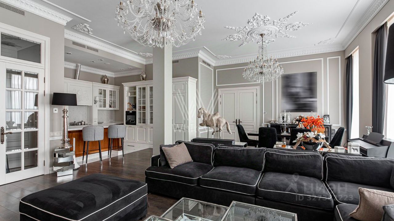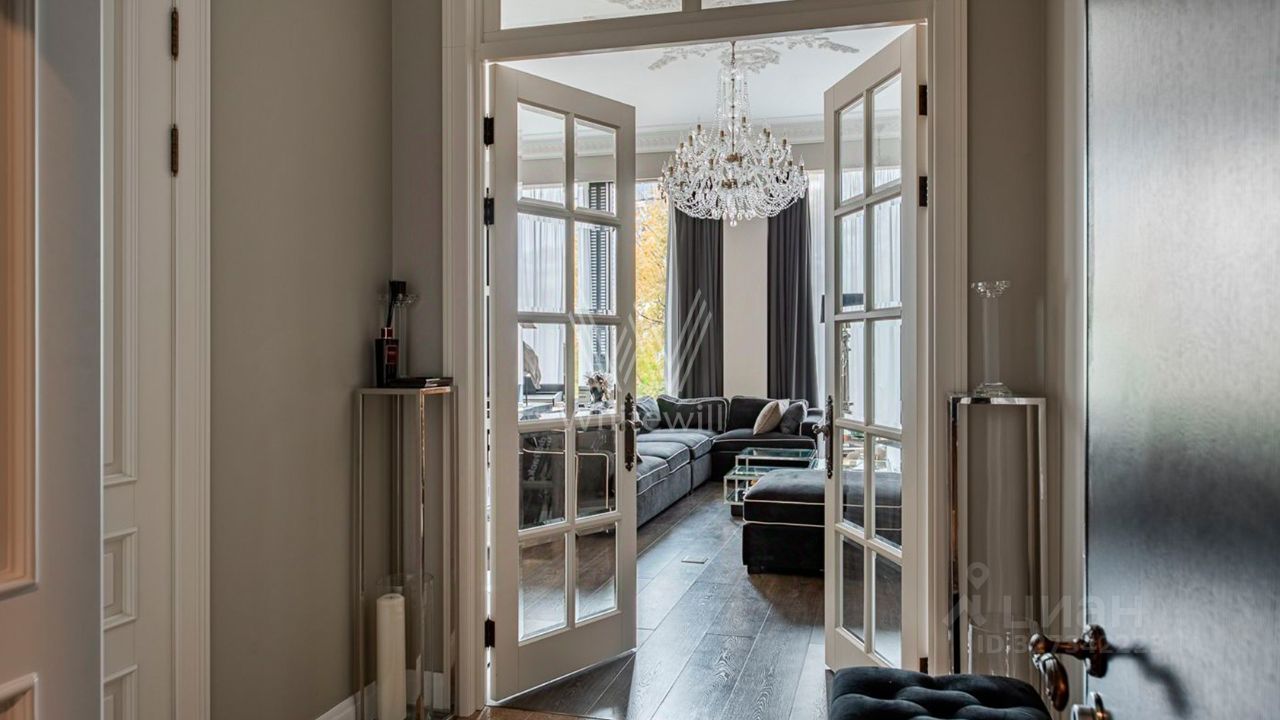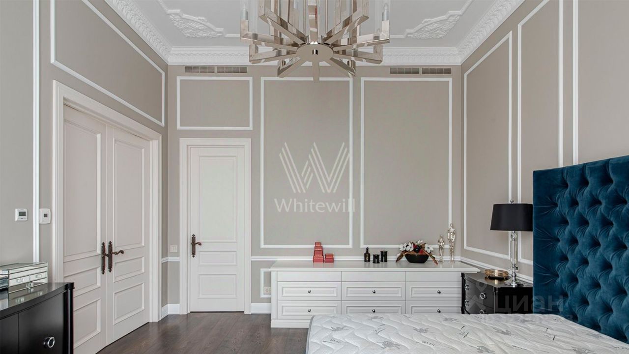 Вся мебель выполнена по специальному заказу, техника от ведущих производителей. Шторы из натурального кашемира с подкладкой блэкаут. Высота потолков 4 метра. Все двери распашные высотой 2,6 метра — придают интерьеру особый шарм. Панорамные окна с видом на набережную.