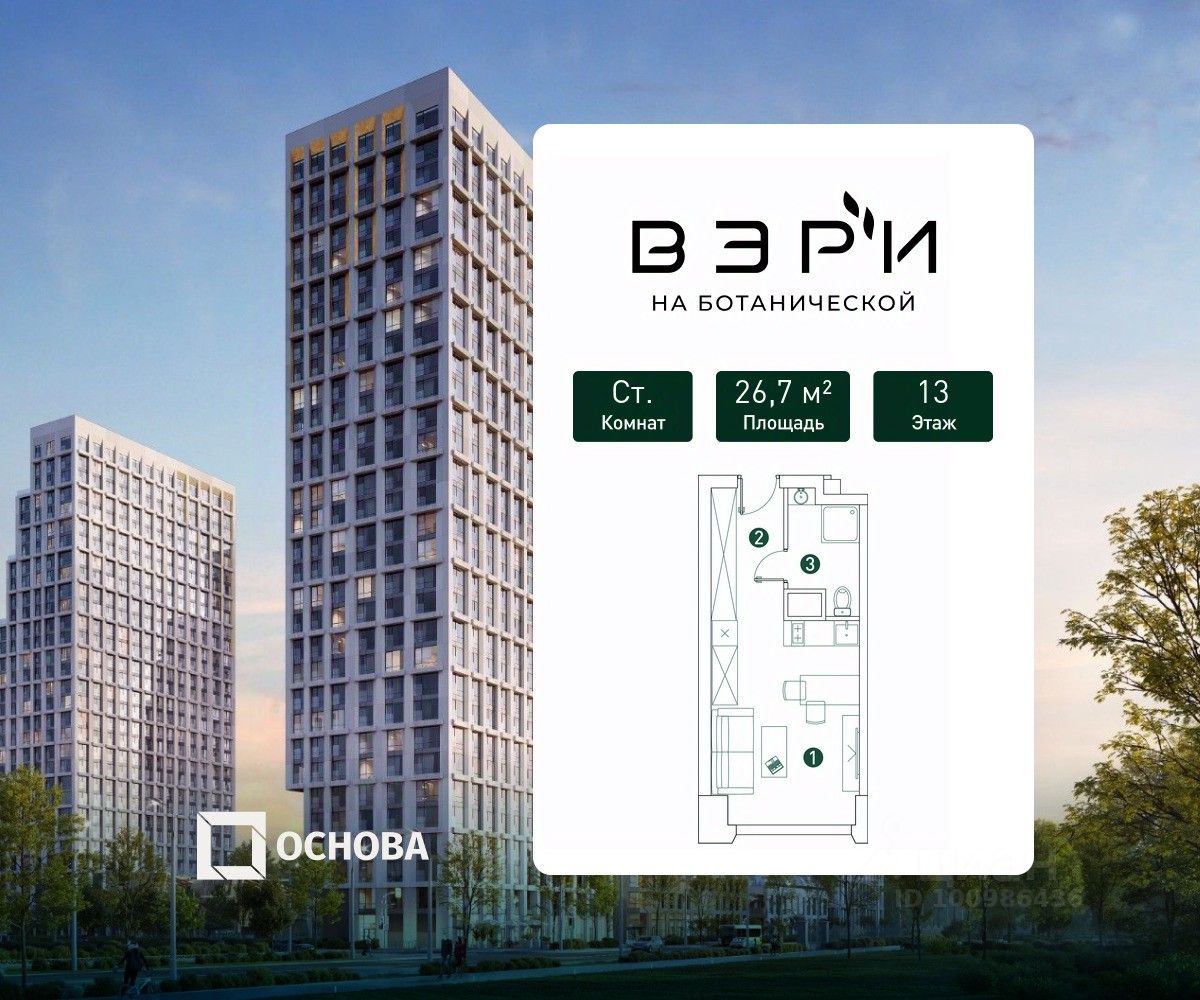 Продается студия площадью 26.7 кв.м. на 13-м этаже 29 этажного дома в ЖК ''ВЭРИ'' от ГК ОСНОВА.