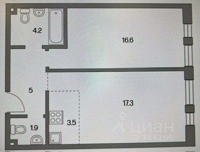 Общая площадь квартиры 48,5 м², расположена на 29 этаже 30-этажного дома, высота потолков 2,95 м. Гостиная с кухней 17,3 м², спальня 16,6 м², 2 санузла 4,2 + 1,9 м², коридор 5 м². Черновая отделка, предметы мебели отсутствуют. Тихий высокий этаж. Панорамный вид на Москву.