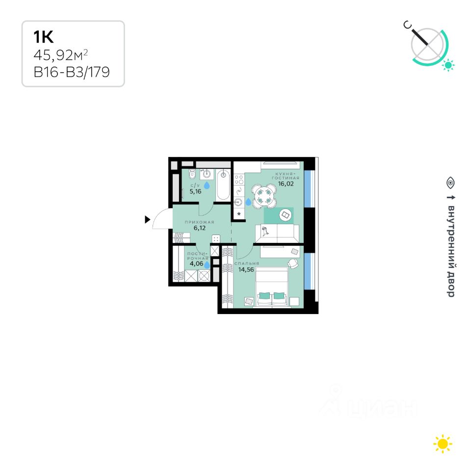 В продаже — однокомнатная квартира с чистовой отделкой, общей площадью 45,92 кв. м. Квартира расположена на втором этаже восьмиэтажного корпуса Балансд в квартале В16 нового района СберСити, который строит Сбер.