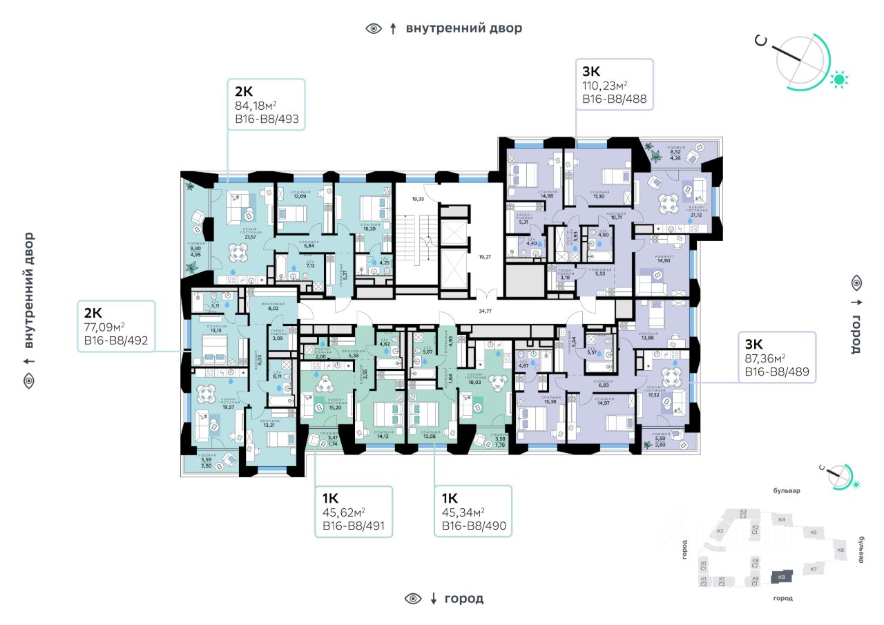 Архитектуру квартала В16 создало итальянское бюро ARCHEA middle east: каждый дом узнаваем, но вместе они складываются в спокойный, цельный ансамбль. В облицовке сочетаются тёплые оттенки кирпича и металла, за счёт игры фактур фасады выглядят живыми и меняются в разное время дня. Строгая геометрия поддерживает ритм города, а мягкая природная палитра помогает чувствовать себя дома, а не в деловом квартале. Дом возводится по технологии монолитного строительства. Квартиры передаются без отделки, что позволяет будущим владельцам реализовать собственные дизайнерские решения и индивидуальные планировки. В квартирах предустановлена система ''умный дом'', объединяющая управление квартирой, домом и прилегающей территорией. Можно регулировать климат и освещение голосом или через смартфон. Высота потолков — от 3,12 м. Квартал состоит из девяти домов средней этажности — от 7 до 10 этажей. Корпуса формируют большой внутренний двор площадью два гектара. Во дворе предусмотрены зоны для разных сценариев: просторные площадки для детей, пространства для активного досуга и спорта, тихие места для отдыха и спокойного времени, а также удобные рабочие места под открытым небом. Здесь легко найти своё — для жизни, здоровья и занятий тем, что действительно нравится. В доме предусмотрены: уютное лобби с зоной ожидания, лапомойка, санузел, помещение для хранения колясок и велосипедов, подземный паркинг.