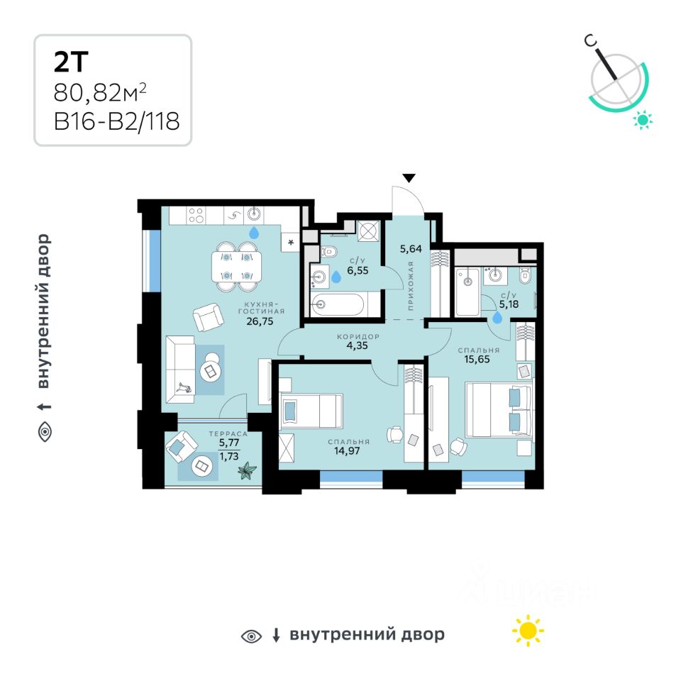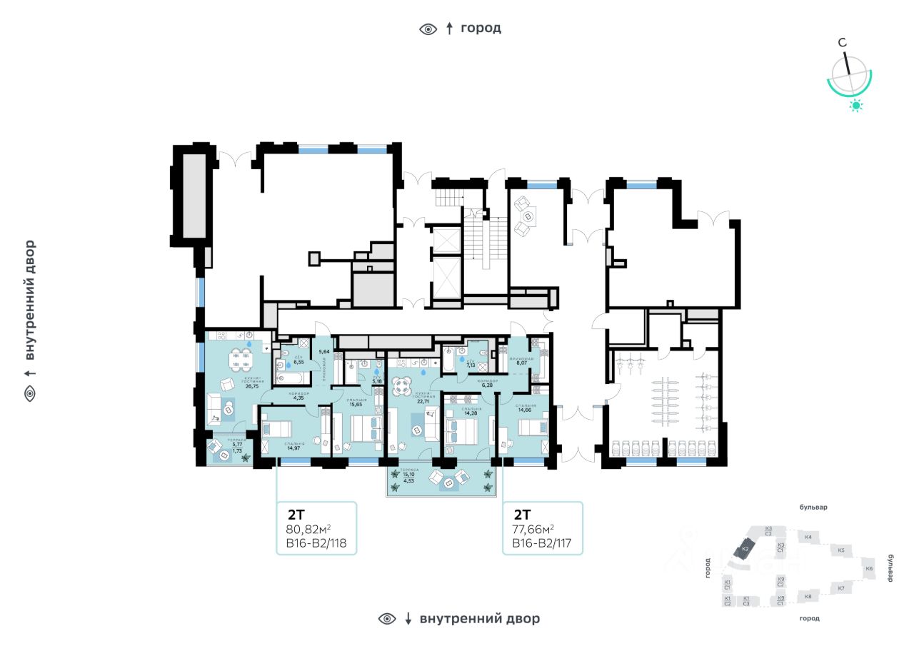 В продаже — двухкомнатная квартира с чистовой отделкой, общей площадью 80,82 кв. м. Квартира расположена на первом этаже десятиэтажного корпуса Балансд в квартале В16 нового района СберСити, который строит Сбер.