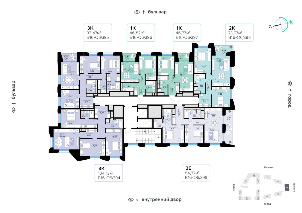 Архитектуру квартала В16 создало итальянское бюро ARCHEA middle east: каждый дом узнаваем, но вместе они складываются в спокойный, цельный ансамбль. В облицовке сочетаются тёплые оттенки кирпича и металла, за счёт игры фактур фасады выглядят живыми и меняются в разное время дня. Строгая геометрия поддерживает ритм города, а мягкая природная палитра помогает чувствовать себя дома, а не в деловом квартале. Дом возводится по технологии монолитного строительства. Все квартиры передаются с чистовой отделкой. Отделка предлагается на выбор в трёх стилях — Новая классика, Скандинавский и Средиземноморский — в нескольких цветовых решениях. В квартирах предустановлена система ''умный дом'', объединяющая управление квартирой, домом и прилегающей территорией. Можно регулировать климат и освещение голосом или через смартфон. Высота потолков — от 3,12 м. Квартал состоит из девяти домов средней этажности — от 7 до 10 этажей. Корпуса формируют большой внутренний двор площадью два гектара. Во дворе предусмотрены зоны для разных сценариев: просторные площадки для детей, пространства для активного досуга и спорта, тихие места для отдыха и спокойного времени, а также удобные рабочие места под открытым небом. Здесь легко найти своё — для жизни, здоровья и занятий тем, что действительно нравится. В доме предусмотрены: уютное лобби с зоной ожидания, зона коворкинга в лобби, детская игровая комната на первом этаже, общественная терраса для досуга резидентов с диванной группой и зоной для йоги с настилом, лапомойка, санузел, помещение для хранения колясок и велосипедов, подземный паркинг.