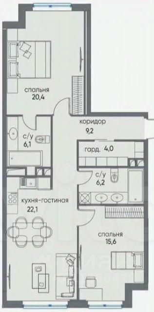 Планировка: -просторная кухнягостиная, -2 комнаты правильной формы, -2 санузла, -гардеробная. -Отделка: без отделки.