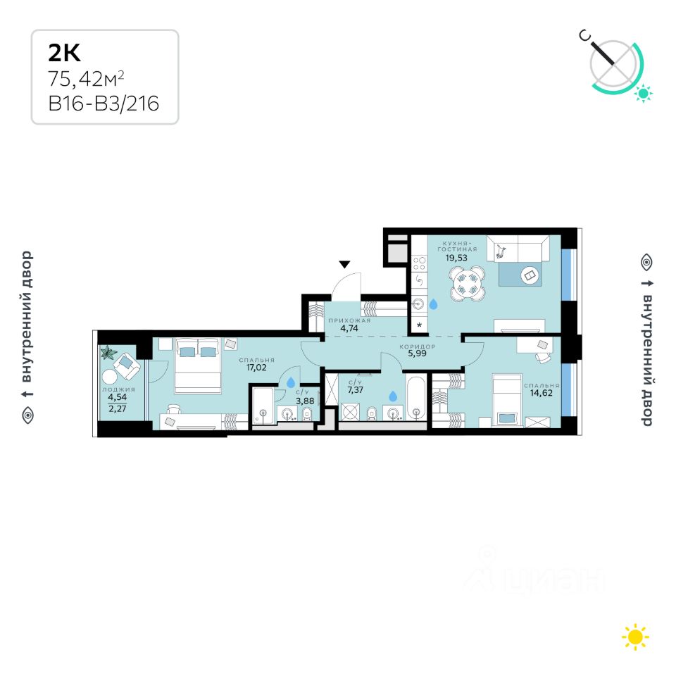 В продаже — двухкомнатная квартира с чистовой отделкой, общей площадью 75,42 кв. м. Квартира расположена на втором этаже десятиэтажного корпуса Балансд в квартале В16 нового района СберСити, который строит Сбер.