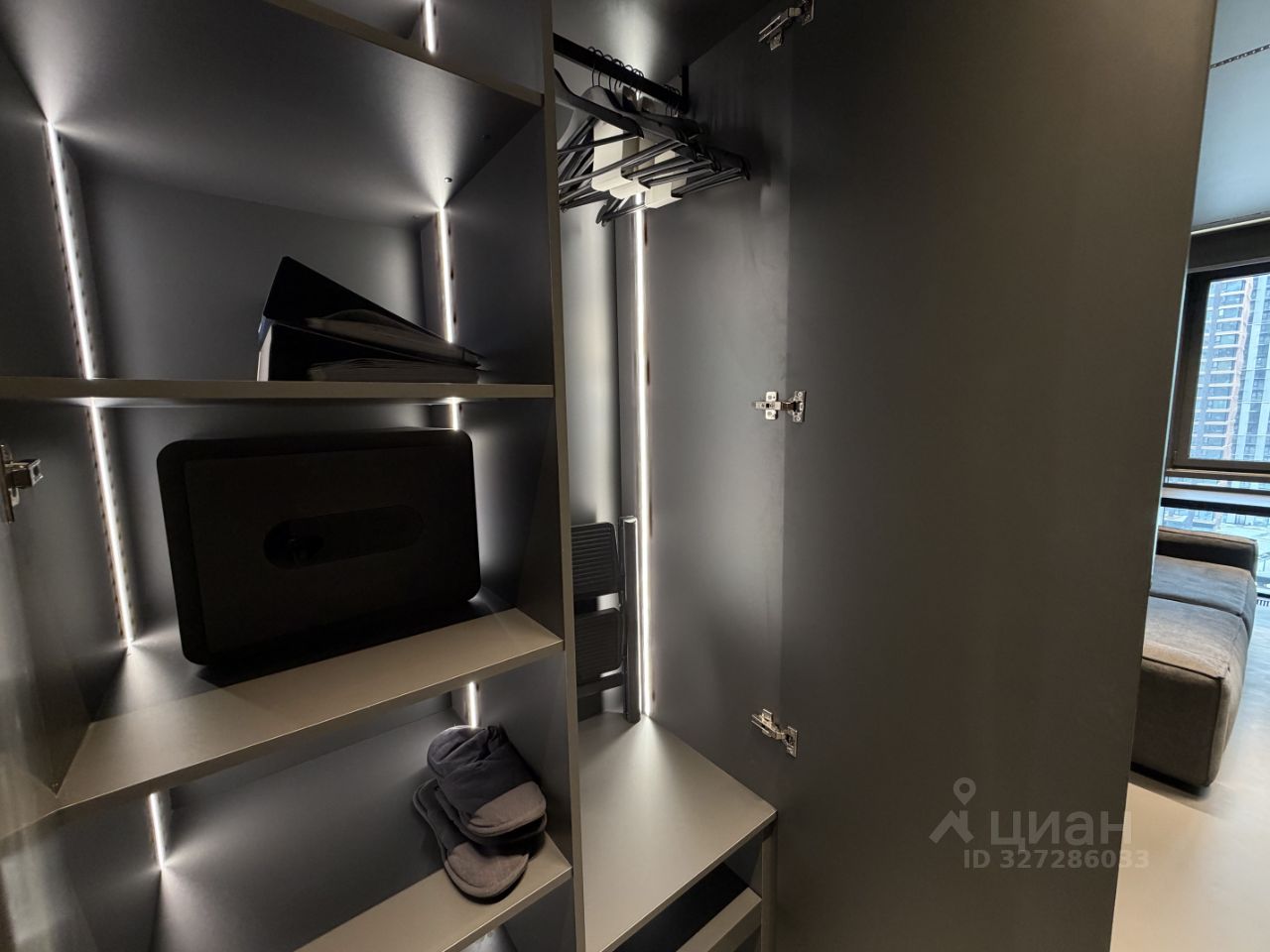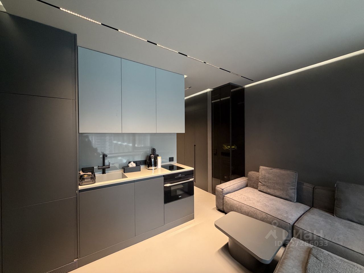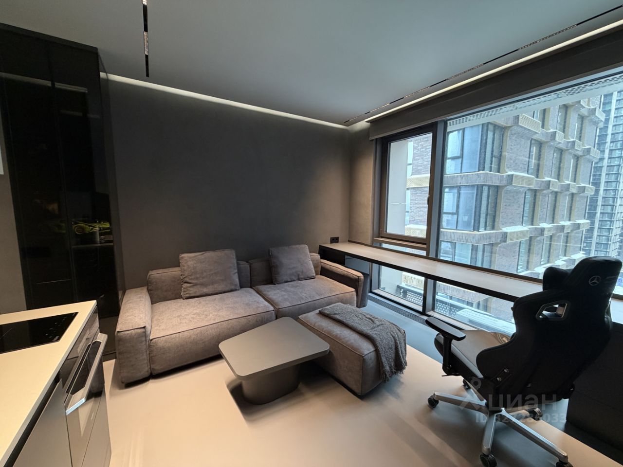 вся мебель встроенная, выполнена на заказ из МДФ (гарантия 2 года) фурнитура Blum (петли, push-механизмы, ящики и наполнение) диван, полки (в санузле) Boca Room игровое кресло Noblechairs EPIC Series Mercedes AMG Petronas Formula One Team подсветка внутри шкафов зеркало в полный рост в пол в прихожей с подсветкой зеркало в санузле с подсветкой