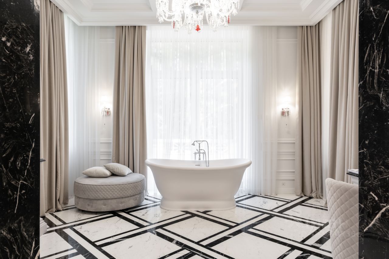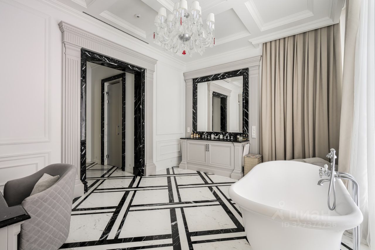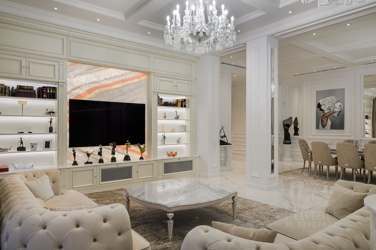 Отделка выполнена в светлых тонах с использованием натуральных материалов (камень, дерево, мрамор). В интерьере много гармонично встроенных малых форм, и различных предметов искусства. Вся мебель и освещение исключительно премиальных брэндов.