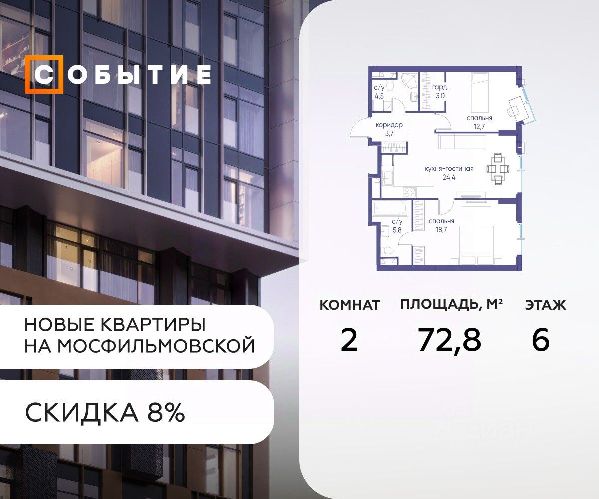 Около 10 минут до Москва Сити и ТТК! В продаже 2-к квартира от застройщика. Общая площадь 72.8, жилая 24, кухня 48.8. Квартира расположена на 6 этаже жилого квартала ''Событие-6'', корпус 2, Секция 1. Квартира без отделки. Срок сдачи: 4 кв. 2029 года.