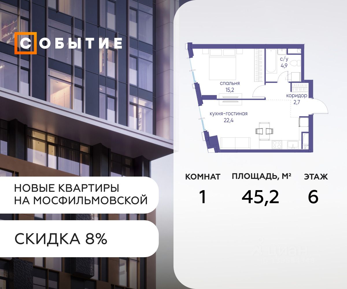 СОБЫТИЕ.6 — финальный дом парк квартала СОБЫТИЕ на Мосфильмовской, созданный для тех, кто хочет ''заняться жизнью'' здесь и сейчас и получать максимум от каждого дня. Стильная архитектура, продуманное благоустройство и богатый набор общественных пространств делают дом естественной сценой для ярких личных событий. Архитектура от бюро Atrium на базе дизайн кода британских LDA Design и UHA London. Лучшая новостройка страны 2025 года!
