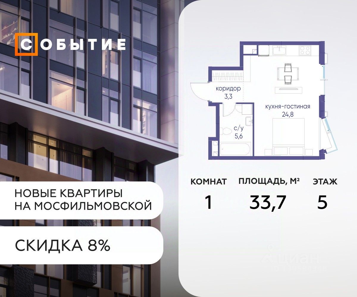 Около 10 минут до Москва Сити и ТТК! В продаже студия от застройщика. Общая площадь 33.7, жилая 6.2, кухня 27.5. Квартира расположена на 5 этаже жилого квартала ''Событие-6'', корпус 2, Секция Секция 2. Квартира без отделки. Срок сдачи: 4 кв. 2029 года.