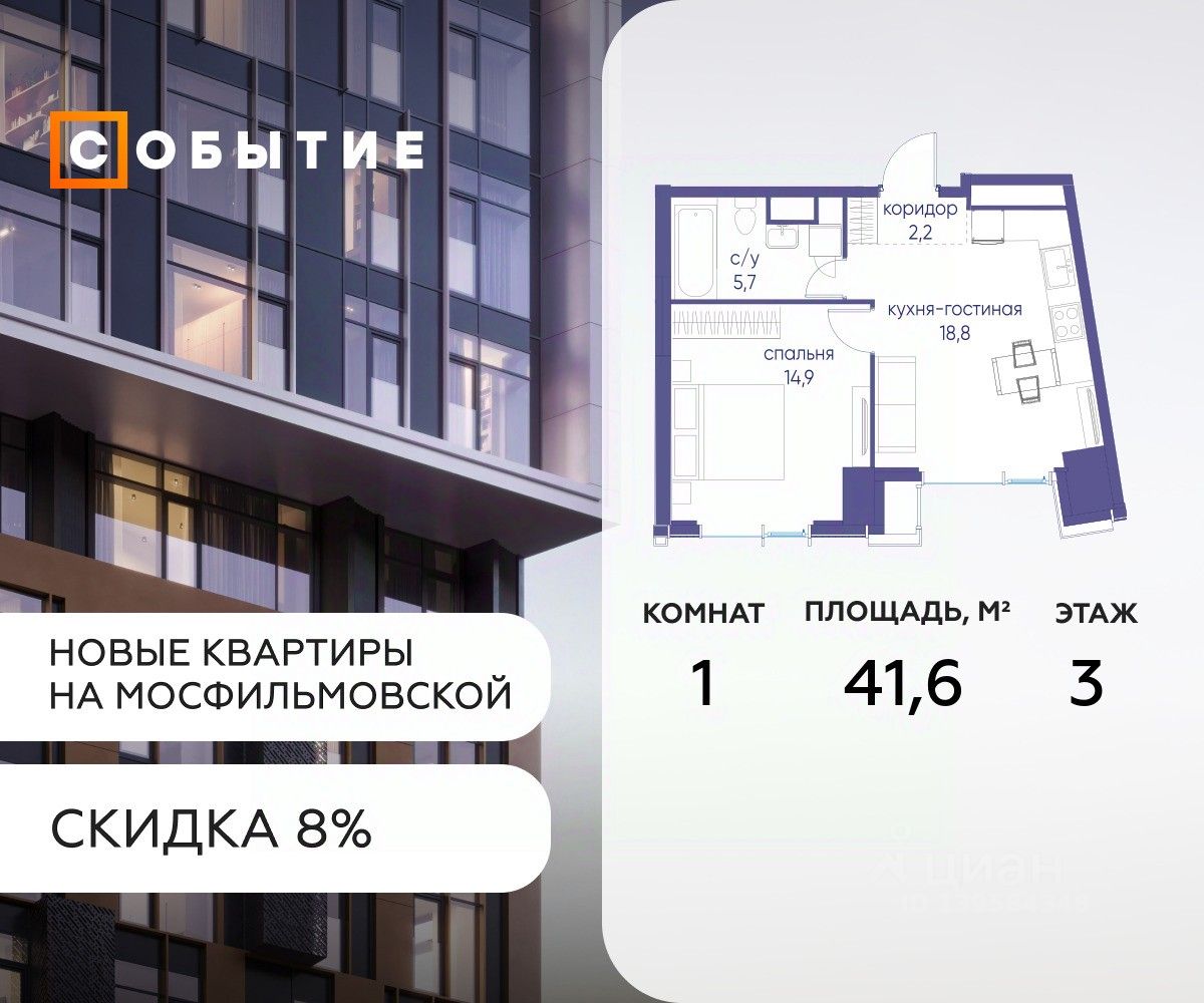 Около 10 минут до Москва Сити и ТТК! В продаже 1-к квартира от застройщика. Общая площадь 41.6, жилая 18.5, кухня 23.1. Квартира расположена на 3 этаже жилого квартала ''Событие-6'', корпус 2, Секция Секция 5. Квартира без отделки. Срок сдачи: 4 кв. 2029 года.