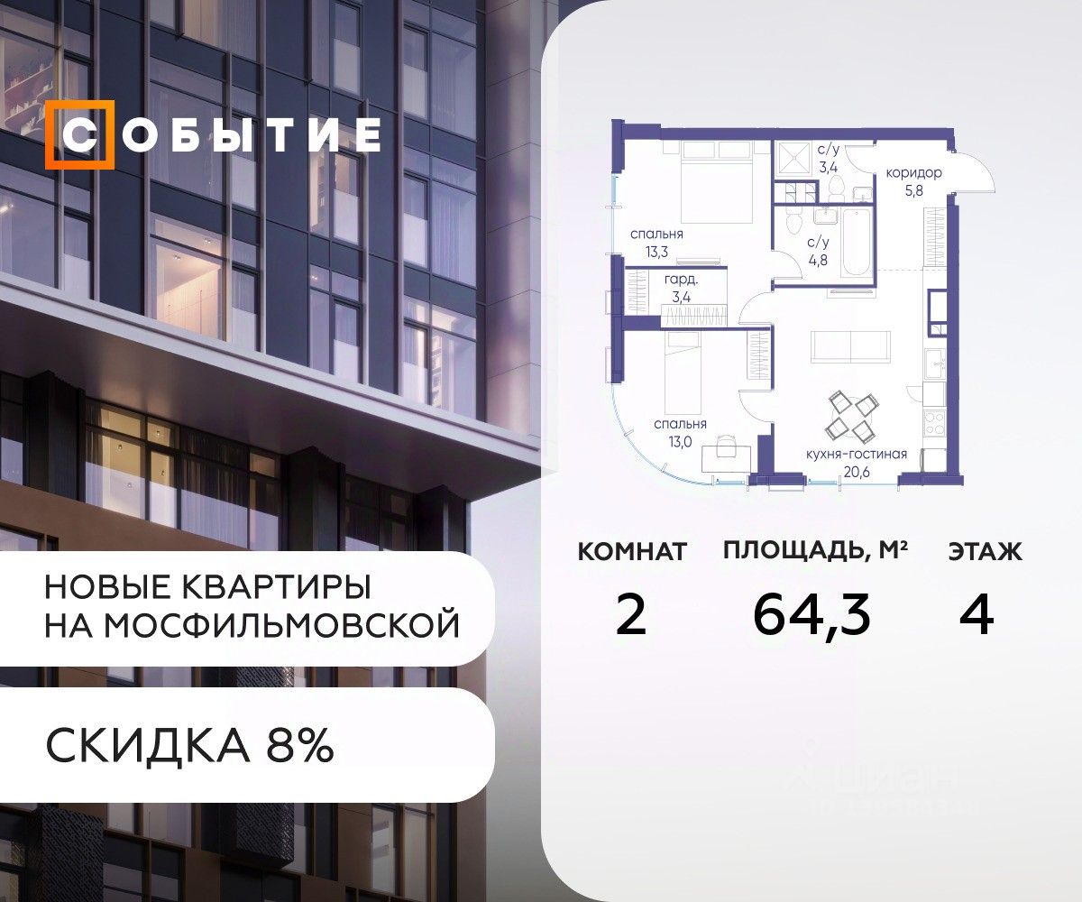 Около 10 минут до Москва Сити и ТТК! В продаже 2-к квартира от застройщика. Общая площадь 64.3, жилая 20.6, кухня 43.7. Квартира расположена на 4 этаже жилого квартала ''Событие-6'', корпус 2, Секция Секция 5. Квартира без отделки. Срок сдачи: 4 кв. 2029 года.