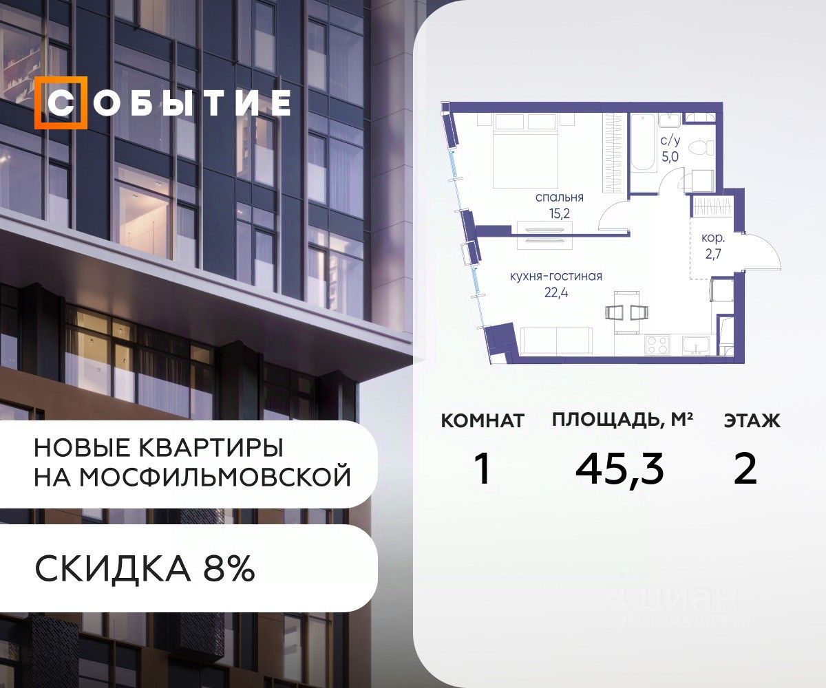 Около 10 минут до Москва Сити и ТТК! В продаже 1-к квартира от застройщика. Общая площадь 45.3, жилая 21.8, кухня 23.5. Квартира расположена на 2 этаже жилого квартала ''Событие-6'', корпус 2, Секция Секция 1. Квартира без отделки. Срок сдачи: 4 кв. 2029 года.