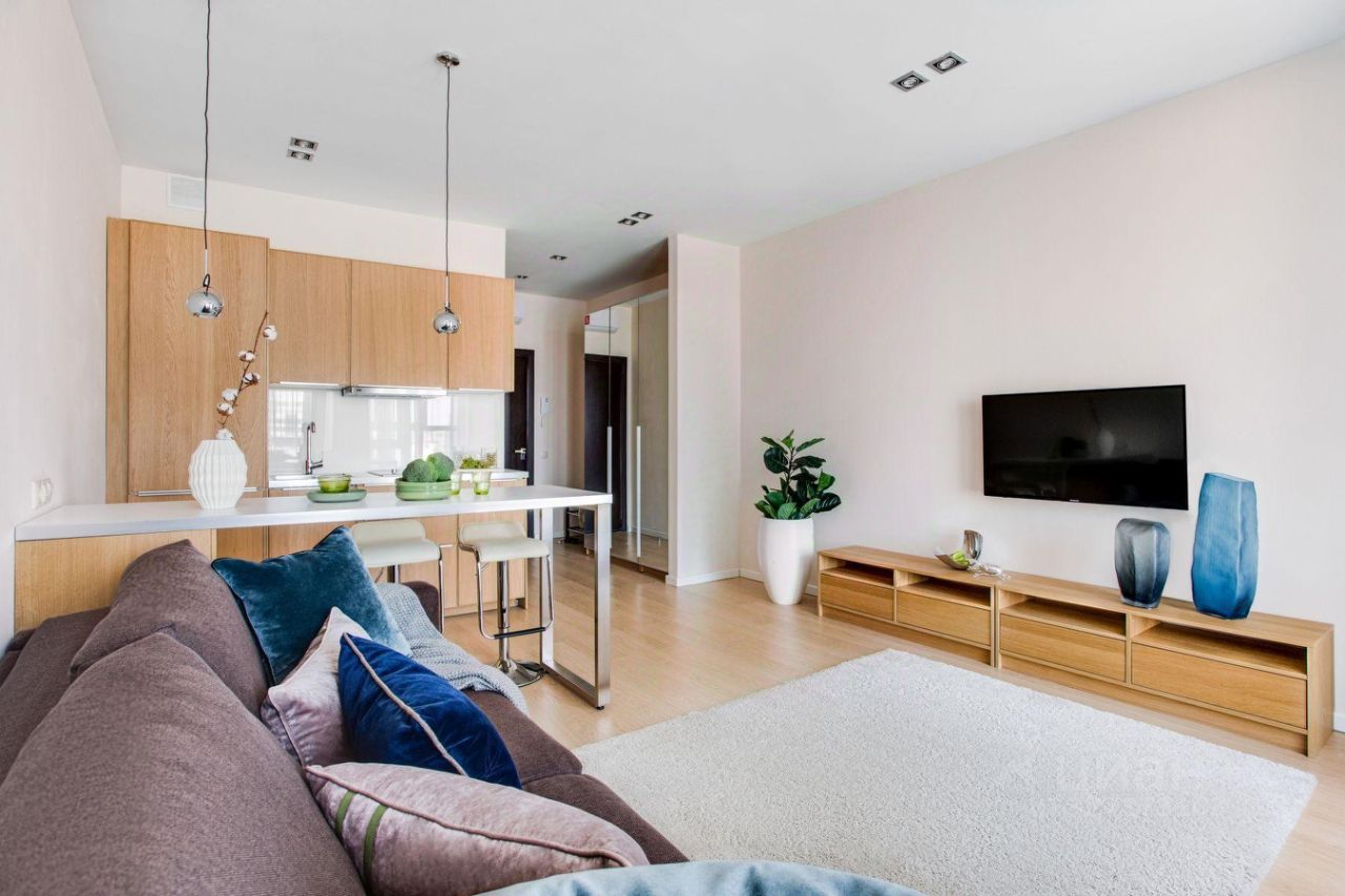 В квартире размещён полный комплект необходимой мебели: - современный кухонный гарнитур, - барная стойка со стульями на две персоны, - двуспальный раскладной диван, - вместительный шкаф.