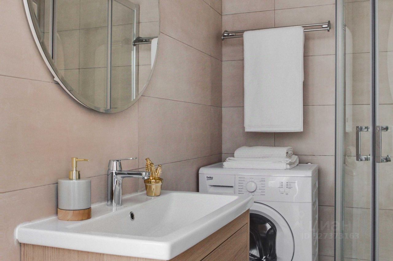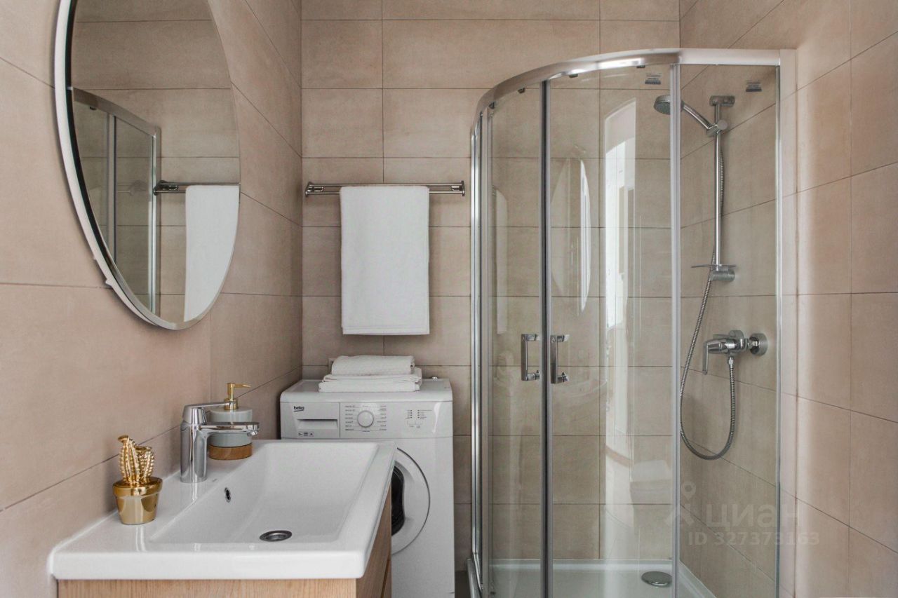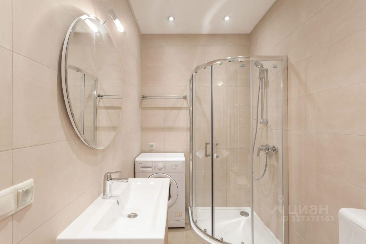 В квартире один совмещенный санузел с душевой кабиной, раковиной, зеркалом с подсветкой и стиральной машиной.