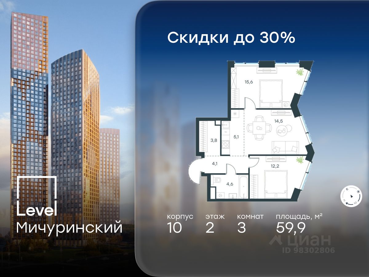 продам 3-к, Левел Мичуринский ЖК, 1031 677 993 ₽