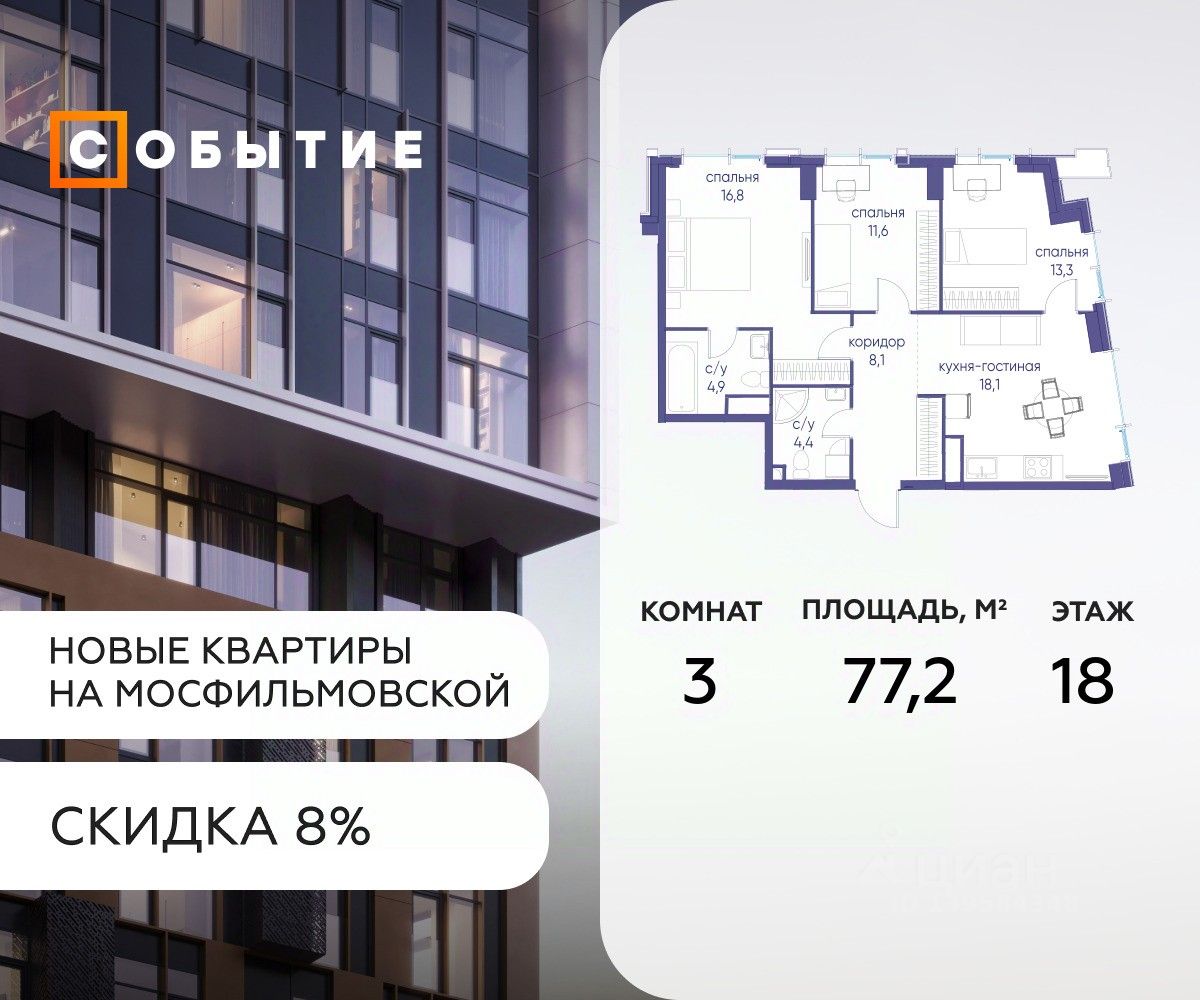 Около 10 минут до Москва Сити и ТТК! В продаже 3-к квартира от застройщика. Общая площадь 77.2, жилая 18, кухня 59.2. Квартира расположена на 18 этаже жилого квартала ''Событие-6'', корпус 2, Секция 5. Квартира без отделки. Срок сдачи: 4 кв. 2029 года.