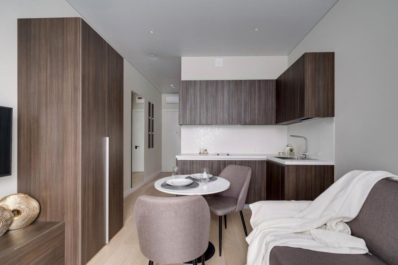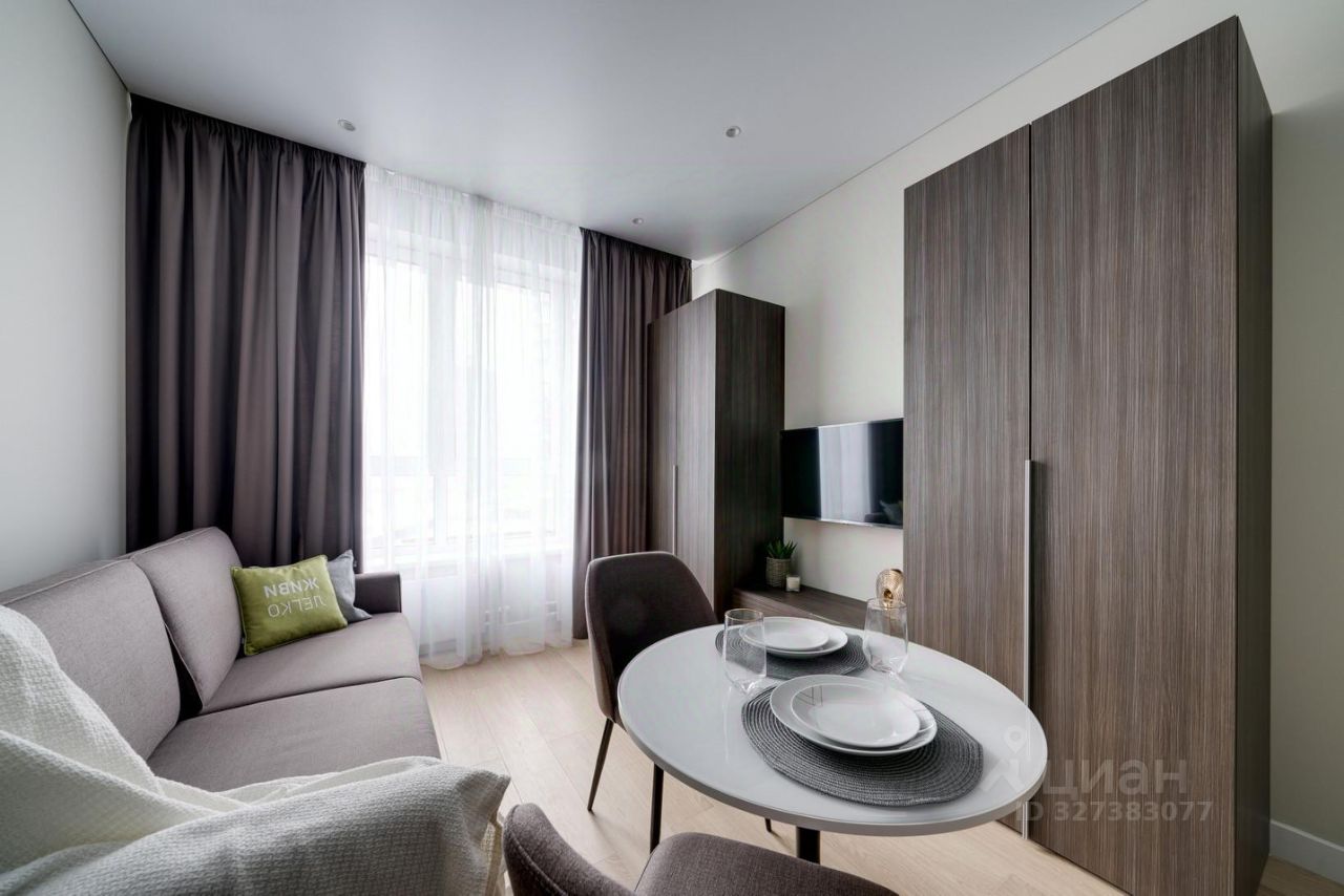 Квартира в современном стиле, с качественной отделкой, мебелью и техникой: - посудомоечная и стиральная машины, - встраиваемая бытовая техника, - кондиционер, - плазменный телевизор c функцией Smart-TV. В квартире размещён полный комплект необходимой мебели: - современный кухонный гарнитур, - компактный обеденный стол со стульями на две персоны, - двуспальный раскладной диван, - вместительный шкаф и мягкий пуф в прихожей. В студии совмещенный санузел с душевой кабиной. Услуги консьерж-сервиса 24/7 включены в арендную плату (прием корреспонденции, заявок на ремонт, выдача гостевых пропусков, и т.д.), дополнительно можно заказать: доставку воды, уборку, стирку, глажку, уход за животными и многое другое.