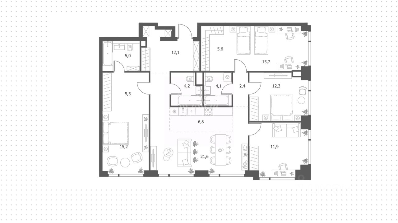 Свободная планировка позволяет организовать пространство по собственному усмотрению. Возможная планировка: кухня-гостиная, 4 спальни, одна из которых мастер-спальня со своей ванной комнатой и гардеробной, всего 3 санузла и холл.