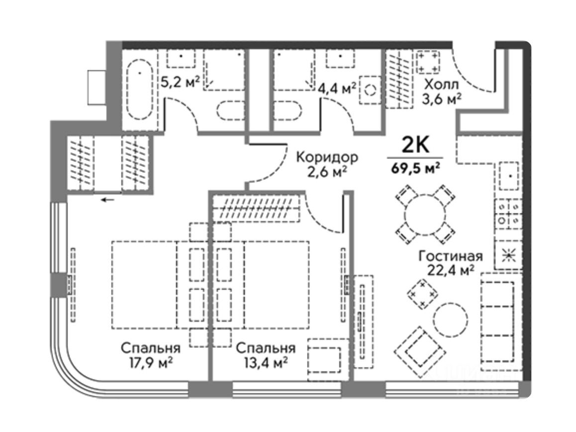 Квартира евро формата, с просторной кухней гостиной. Функциональная планировка с полноценным мастер блоком, двумя санузлами 5.2 и 4.4м2. Идеально подойдет для семьи.