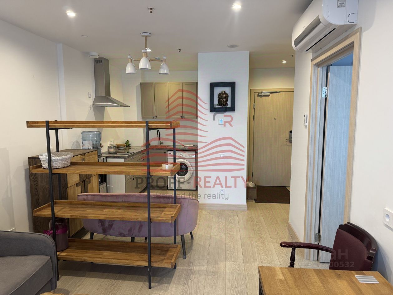 Интерьер апартаментов продуман до мелочей: вместительная спальня, удобная гостиная, функциональная кухня с панорамными окнами, оснащённая встроенной плитой и стиральной машиной, а также множеством удобных шкафов для хранения вещей.
