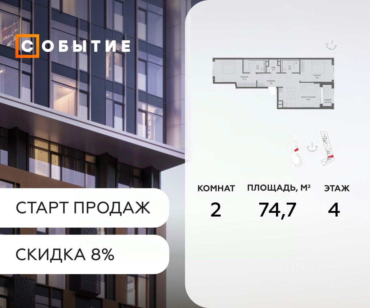 Около 10 минут до Москва Сити и ТТК! В продаже 2-к квартира от застройщика. Общая площадь 74.7, жилая 23.3, кухня 51.4. Квартира расположена на 4 этаже жилого квартала ''Событие-6'', корпус 1, Секция 3. Квартира без отделки. Срок сдачи: 4 кв. 2029 года.