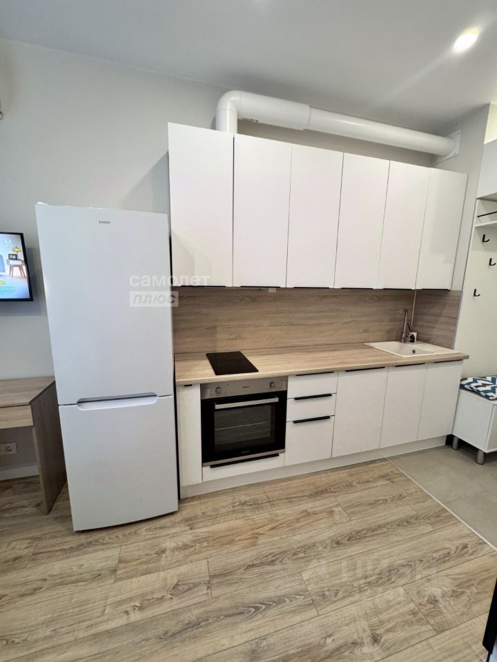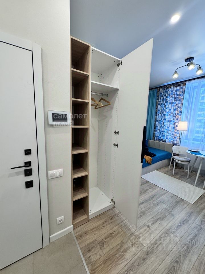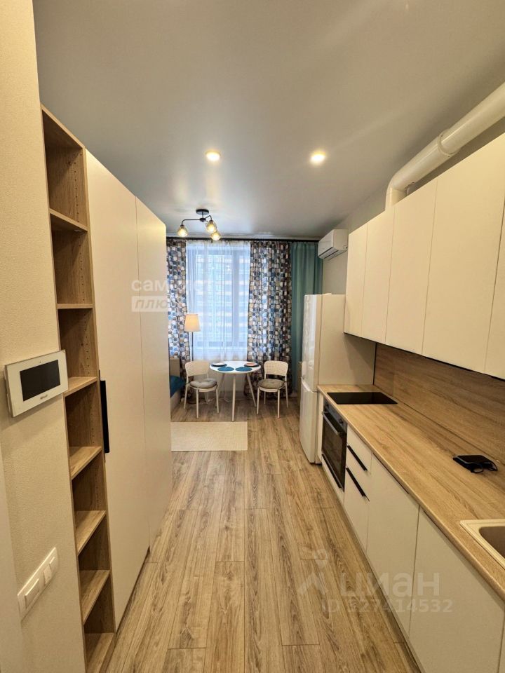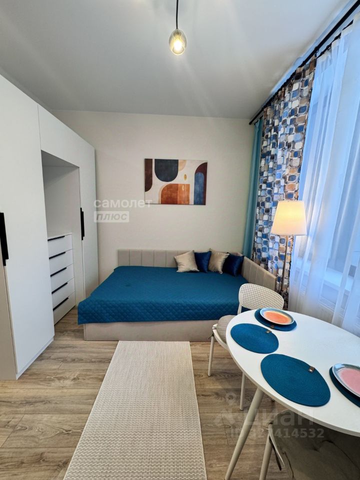 Предлагается уютная, светлая студия в новом жилом комплексе бизнес-класса. В студии есть зона прихожей ,оборудованная вешалкой для верхней одежды, шкафы для хранения обуви. Кухня, в которой есть варочная панель, посудомоечная машина, и верхние шкафы для хранения посуды и всего необходимого. Так же есть столовая зона: круглый стол и два стула. Если ее сдвинуть открывается пространство рабочей зоны. В студии продуманное зонирование, область спальни не видна из прихожей. Удобное спальное место, с внутренним ящиком под постельное белье. Совмещенный санузел с душевой кабиной, и консольным унитазом. Грамотное распоряжение пространством позволило расположить там же стиральную машину, а возле зеркала ящики для ванных принадлежностей. Система освещения на потолке: встроенные лампочки и люстра. В студии установлены кондиционер и пожарная сигнализация. Окна выходят во двор.