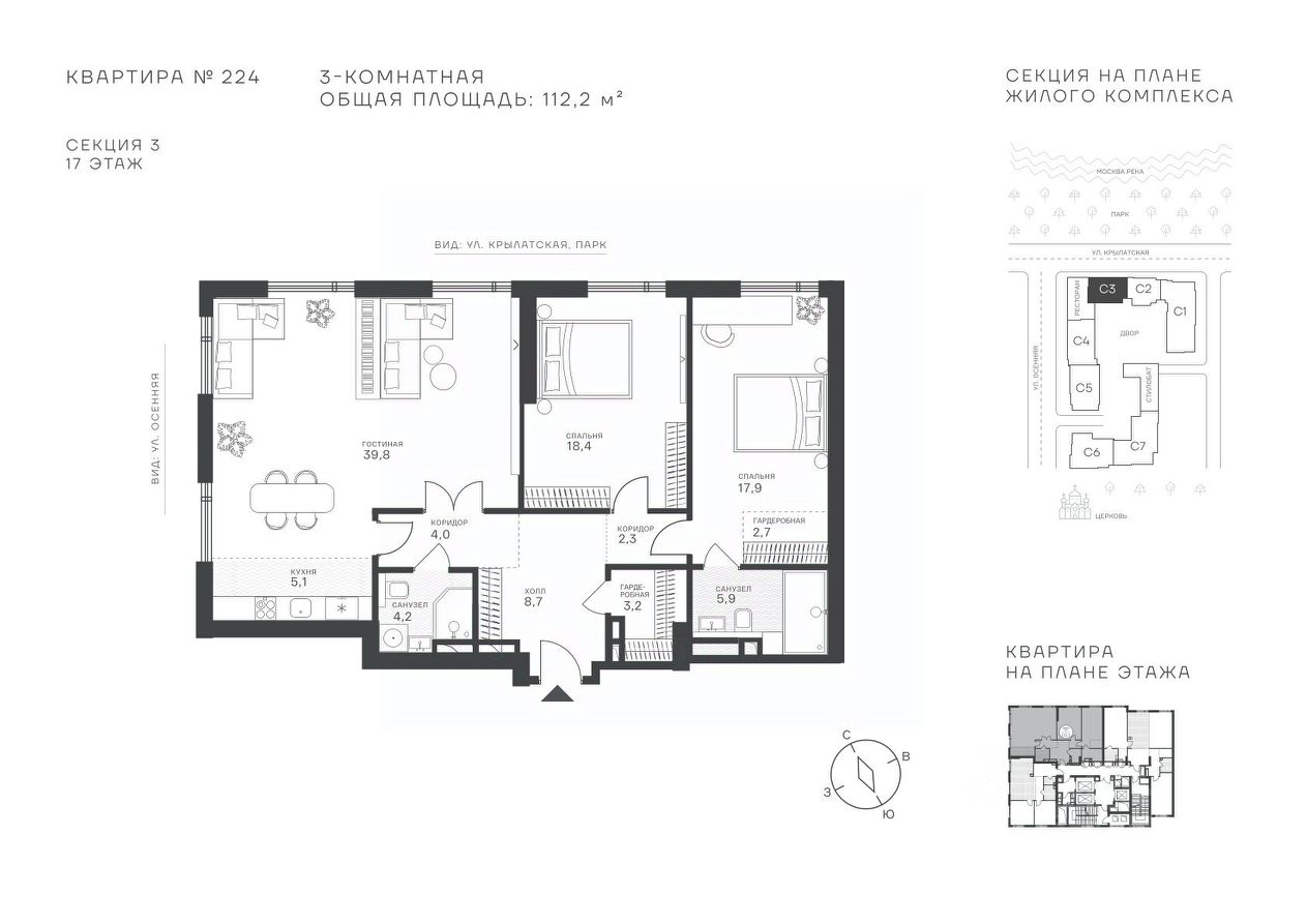 Успейте стать частью уникального проекта премиум-класса на западе Москвы! В продаже квартиры: 1-комнатные от 28,1 м², 2-комнатные от 61,2 м², 3-комнатные от 86,6 м², 4-комнатные от 110,7 м². Первый взнос от 30%! Рассрочка на 2 года без переплат! Крылатское 33 это премиальный жилой комплекс от специализированного застройщика ООО ''Сияние''. Самый высокий небоскрёб в районе, достигающий отметки в 150 метров и малоэтажный клубный формат высотой от 42 метров на приватной территории площадью 1,4 га. Великолепные виды на излучину Москва-реки, Живописный мост и урбанистический облик города. Эксклюзивные форматы квартир с панорамным остеклением и патио-террасами. Двухуровневый паркинг на 271м/м, премиальные входные группы, ресторан высокой кухни, детский сад и эко-маркет на территории комплекса. Эксклюзивные преимущества: доступ к wellness-центру, коворкингу и клубной гостиной только для резидентов. Над проектом работали именитые российские архитектурные бюро: архитектор проекта бюро ''Остоженка'', планировочные решения от бюро Александры Федоровой. Расположение Пешком: 5-7 минут - до парка Звезд, Крылатского парка и набережной Москвы-реки, 15 минут - до метро Крылатское Арбатско-Покровской линии, 15 минут - до пристани Крылатская. На автомобиле: 10 минут - до Третьего транспортного кольца, 15 минут - до Садового кольца и Москва- Сити, 20-30 минут - до Аэропорта Внуково, 30-40 минут - до Аэропорта Шереметьево. В 300 метрах от комплекса - удобная транспортная развязка с проспектом Маршала Жукова, обеспечивающая легкий доступ к ключевым магистралям. Благоустройство: