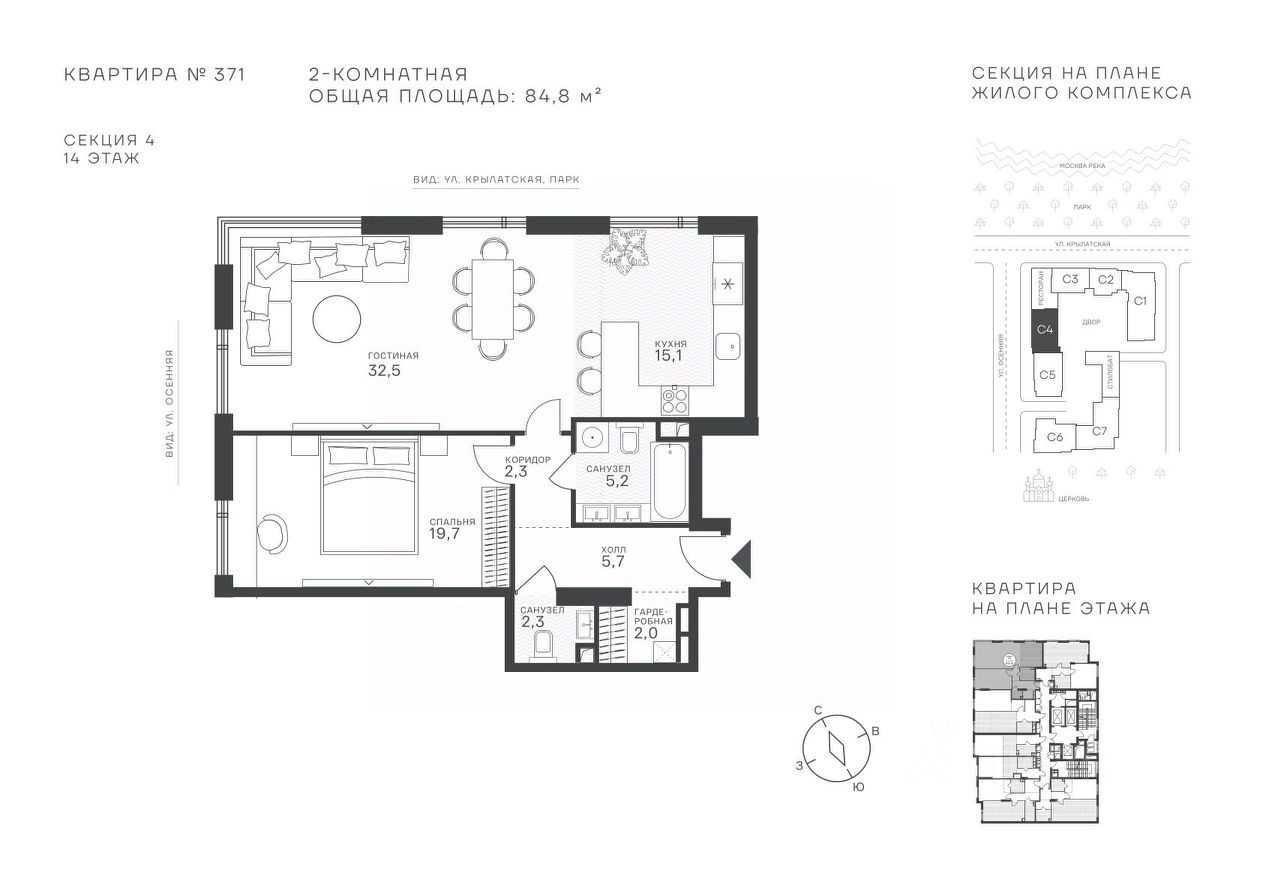 Успейте стать частью уникального проекта премиум-класса на западе Москвы! В продаже квартиры: 1-комнатные от 28,1 м², 2-комнатные от 61,2 м², 3-комнатные от 86,6 м², 4-комнатные от 110,7 м². Первый взнос от 30%! Рассрочка на 2 года без переплат! Крылатское 33 это премиальный жилой комплекс от специализированного застройщика ООО ''Сияние''. Самый высокий небоскрёб в районе, достигающий отметки в 150 метров и малоэтажный клубный формат высотой от 42 метров на приватной территории площадью 1,4 га. Великолепные виды на излучину Москва-реки, Живописный мост и урбанистический облик города. Эксклюзивные форматы квартир с панорамным остеклением и патио-террасами. Двухуровневый паркинг на 271м/м, премиальные входные группы, ресторан высокой кухни, детский сад и эко-маркет на территории комплекса. Эксклюзивные преимущества: доступ к wellness-центру, коворкингу и клубной гостиной только для резидентов. Над проектом работали именитые российские архитектурные бюро: архитектор проекта бюро ''Остоженка'', планировочные решения от бюро Александры Федоровой. Расположение Пешком: 5-7 минут - до парка Звезд, Крылатского парка и набережной Москвы-реки, 15 минут - до метро Крылатское Арбатско-Покровской линии, 15 минут - до пристани Крылатская. На автомобиле: 10 минут - до Третьего транспортного кольца, 15 минут - до Садового кольца и Москва- Сити, 20-30 минут - до Аэропорта Внуково, 30-40 минут - до Аэропорта Шереметьево. В 300 метрах от комплекса - удобная транспортная развязка с проспектом Маршала Жукова, обеспечивающая легкий доступ к ключевым магистралям. Благоустройство: