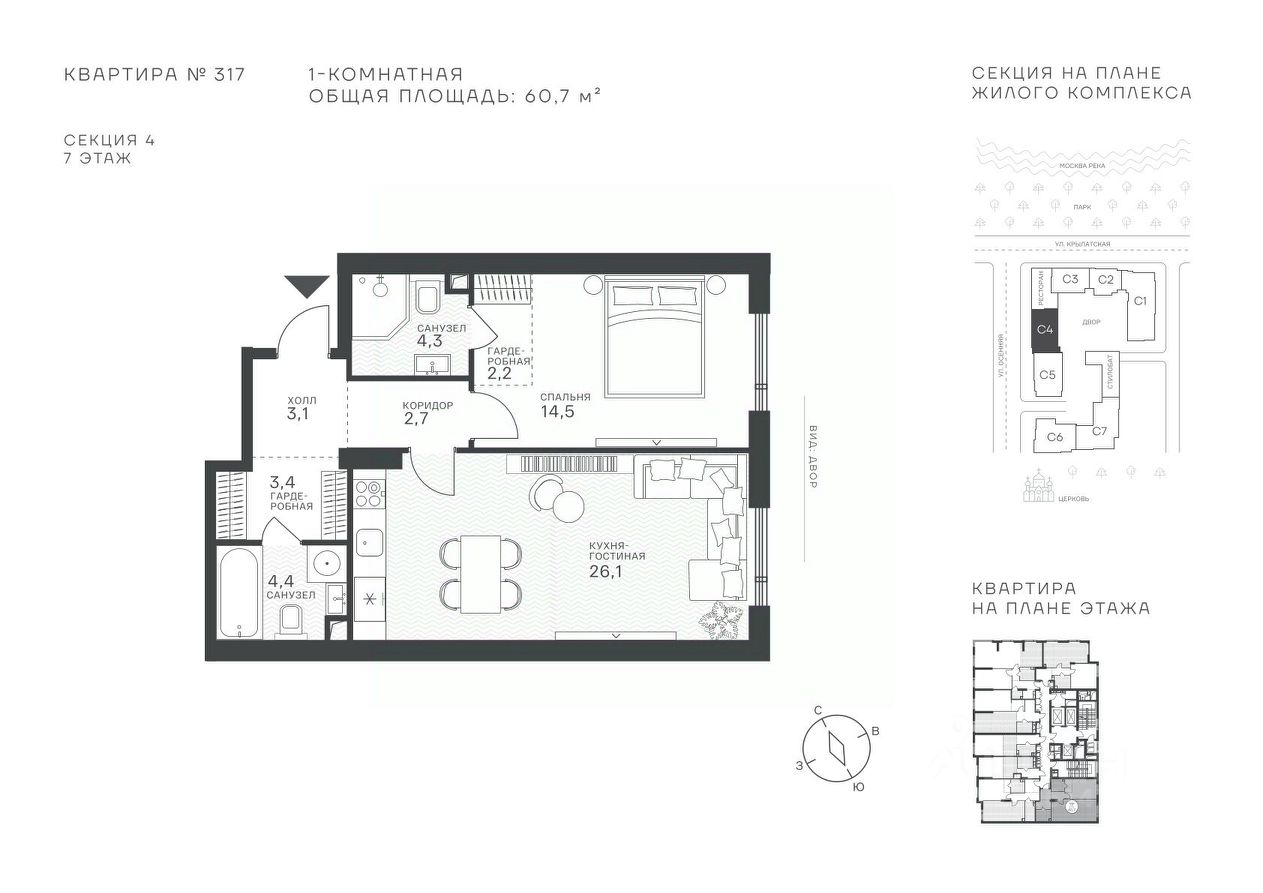 Успейте стать частью уникального проекта премиум-класса на западе Москвы! В продаже квартиры: 1-комнатные от 28,1 м², 2-комнатные от 61,2 м², 3-комнатные от 86,6 м², 4-комнатные от 110,7 м². Первый взнос от 30%! Рассрочка на 2 года без переплат! Крылатское 33 это премиальный жилой комплекс от специализированного застройщика ООО ''Сияние''. Самый высокий небоскрёб в районе, достигающий отметки в 150 метров и малоэтажный клубный формат высотой от 42 метров на приватной территории площадью 1,4 га. Великолепные виды на излучину Москва-реки, Живописный мост и урбанистический облик города. Эксклюзивные форматы квартир с панорамным остеклением и патио-террасами. Двухуровневый паркинг на 271м/м, премиальные входные группы, ресторан высокой кухни, детский сад и эко-маркет на территории комплекса. Эксклюзивные преимущества: доступ к wellness-центру, коворкингу и клубной гостиной только для резидентов. Над проектом работали именитые российские архитектурные бюро: архитектор проекта бюро ''Остоженка'', планировочные решения от бюро Александры Федоровой. Расположение Пешком: 5-7 минут - до парка Звезд, Крылатского парка и набережной Москвы-реки, 15 минут - до метро Крылатское Арбатско-Покровской линии, 15 минут - до пристани Крылатская. На автомобиле: 10 минут - до Третьего транспортного кольца, 15 минут - до Садового кольца и Москва- Сити, 20-30 минут - до Аэропорта Внуково, 30-40 минут - до Аэропорта Шереметьево. В 300 метрах от комплекса - удобная транспортная развязка с проспектом Маршала Жукова, обеспечивающая легкий доступ к ключевым магистралям. Благоустройство: