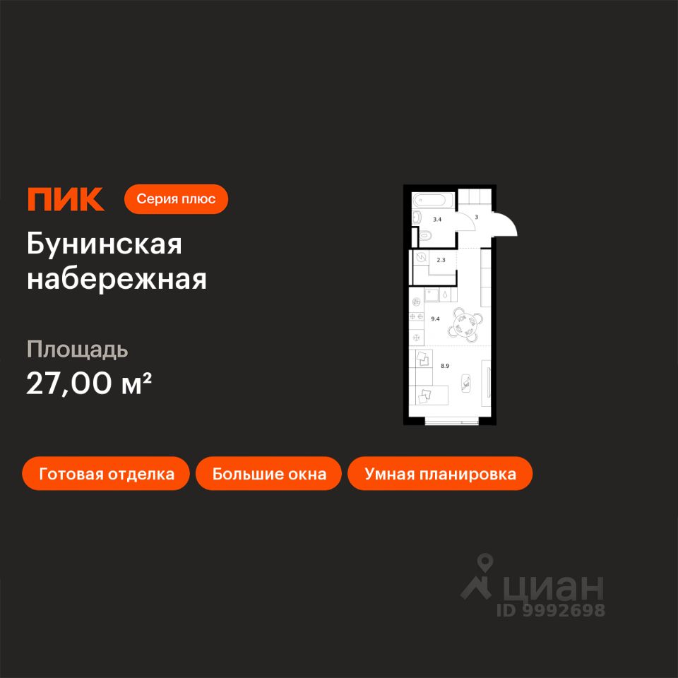 Продаётся квартира-студия площадью 27 кв.м на 8 этаже 16 этажного дома (Корпус 2.6/1.5, Секция 5) проекта ПИК Бунинская набережная. Светлый просторный подъезд на уровне земли, функциональная планировка, большие окна, c отделкой.