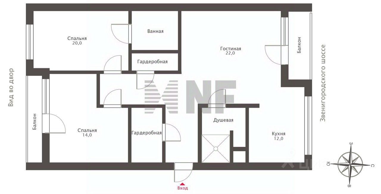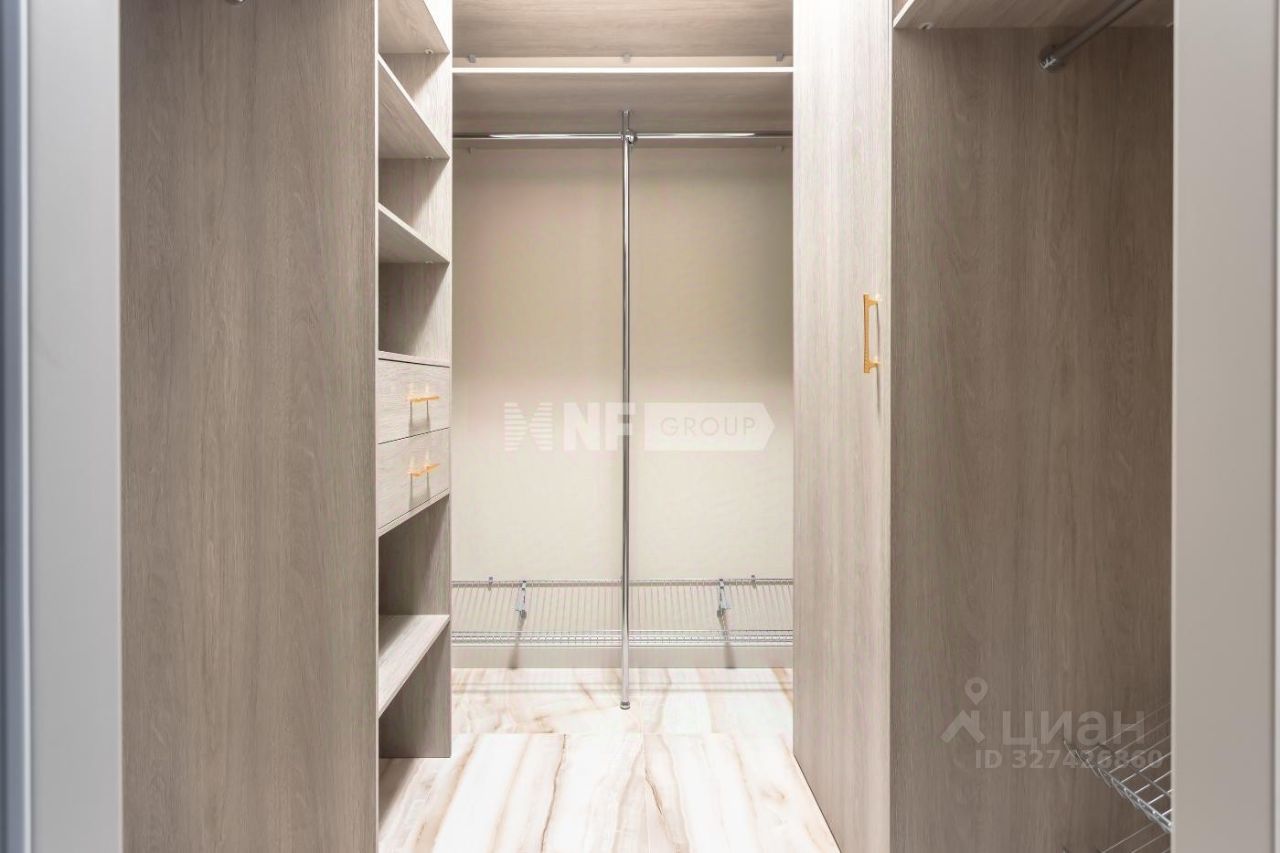Планировка: гостиная с зоной кухни и выходом на балкон, мастер-спальня с ванной комнатой, спальня с выходом на балкон, гостевой санузел с душевой кабиной, гардеробная, постирочная.