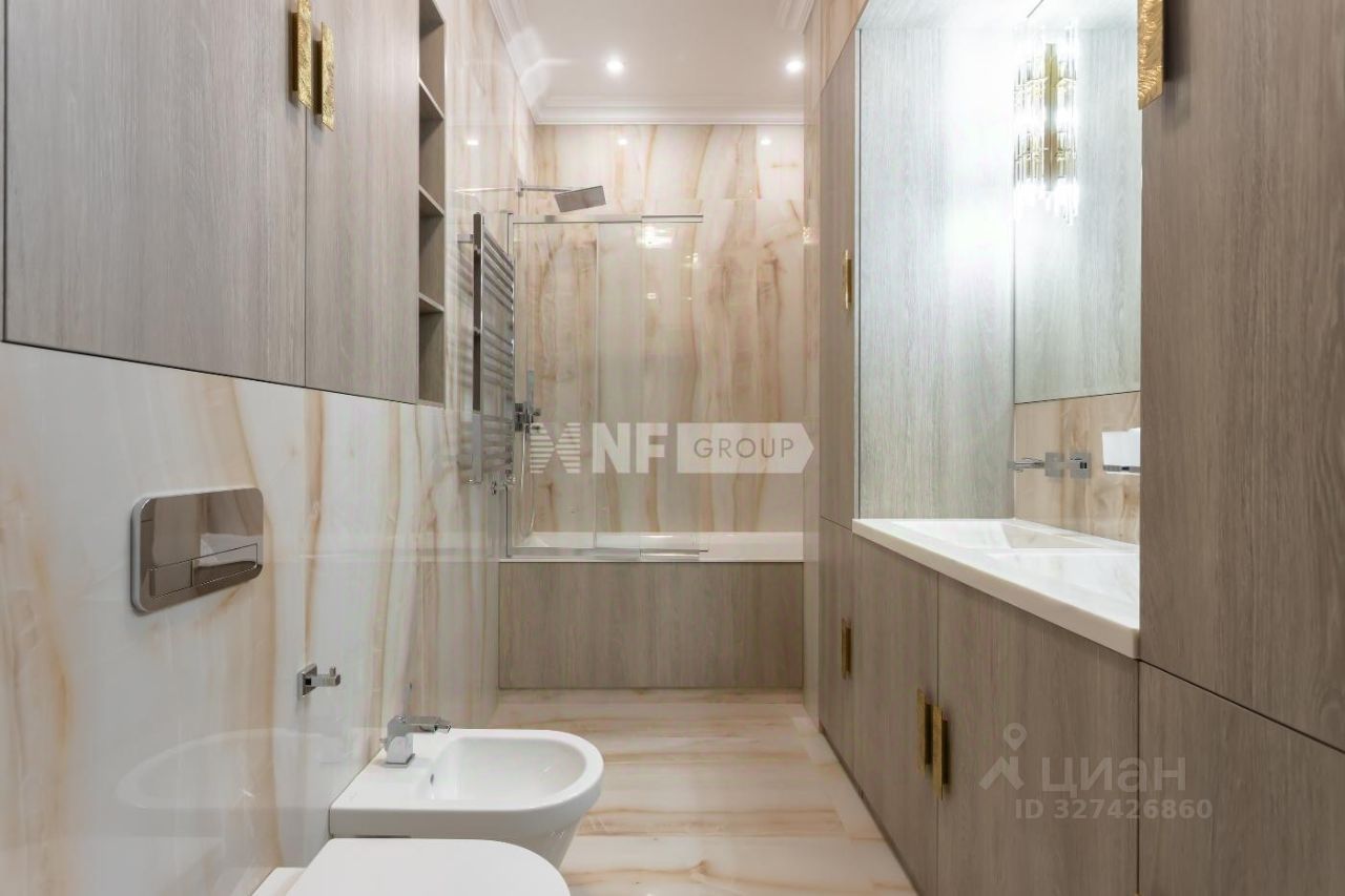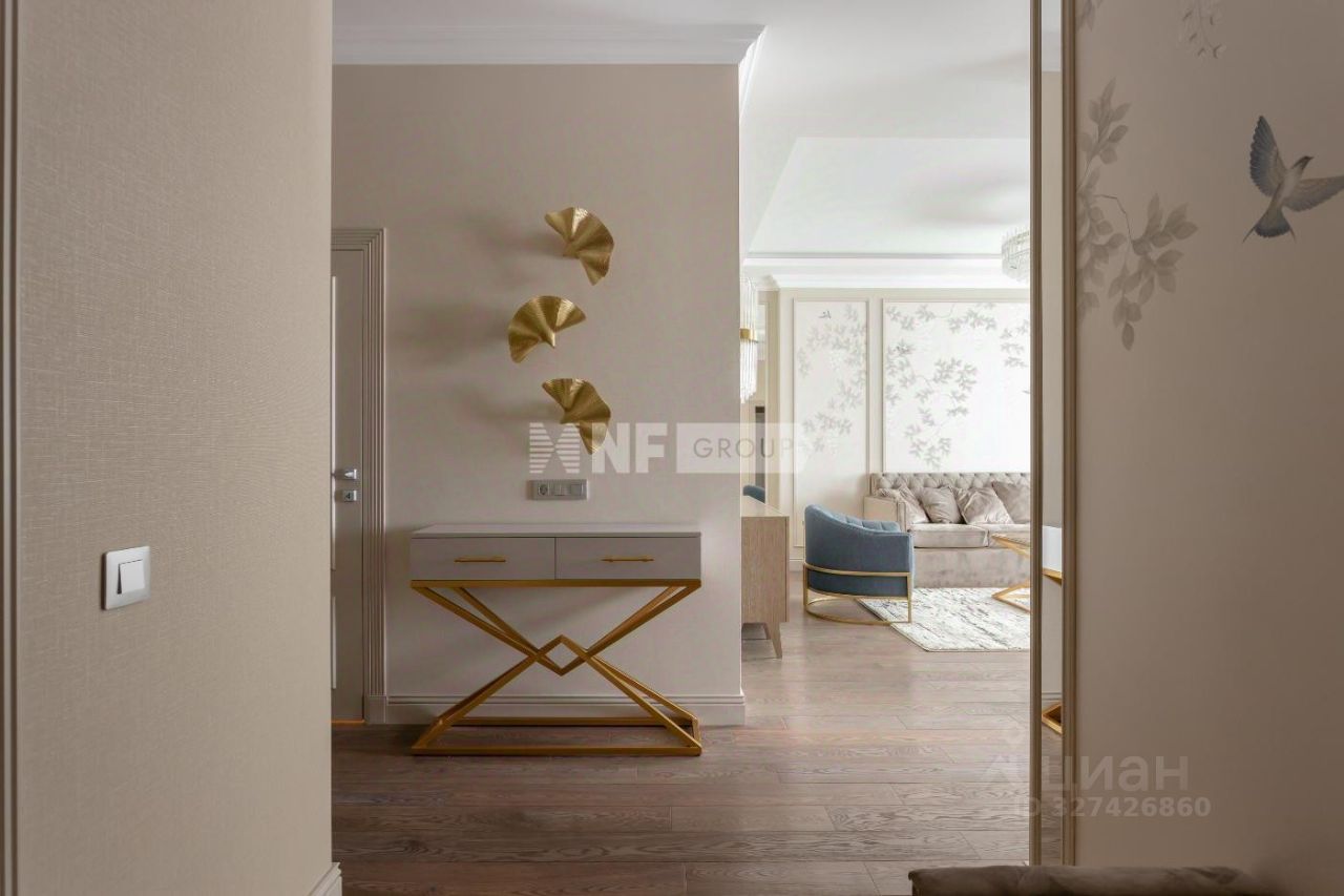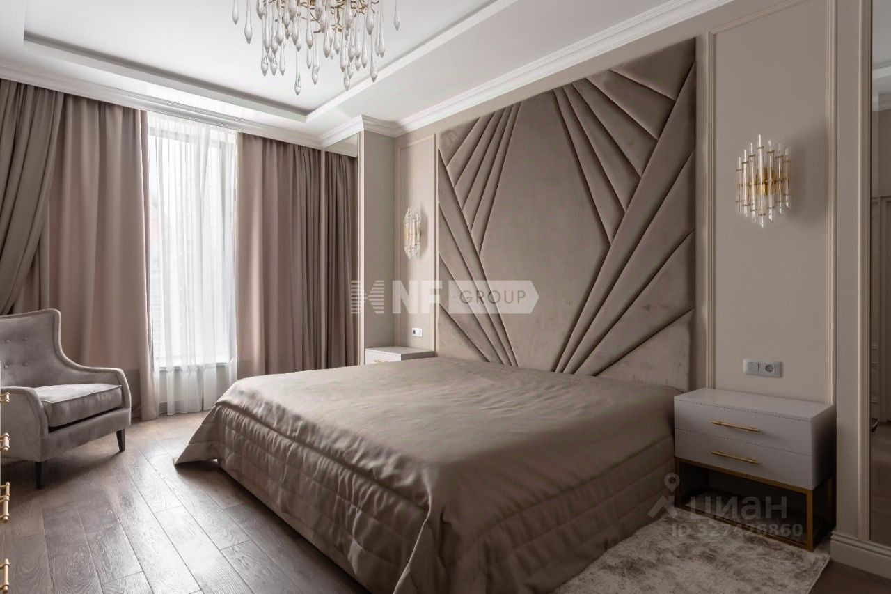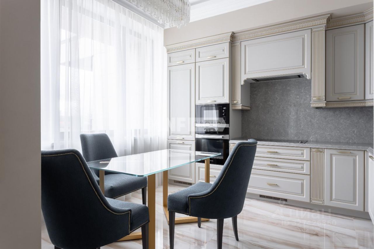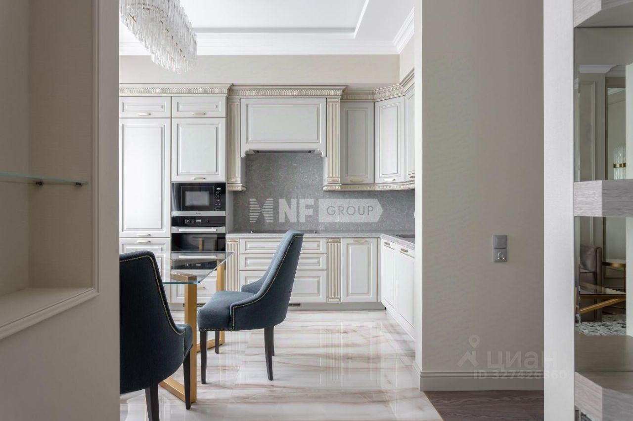 Выполнена дорогая отделка в стиле ар-деко с применением натуральных материалов, установлена мебель ведущих фабрик, выполненная на заказ, бытовая техника Miele.